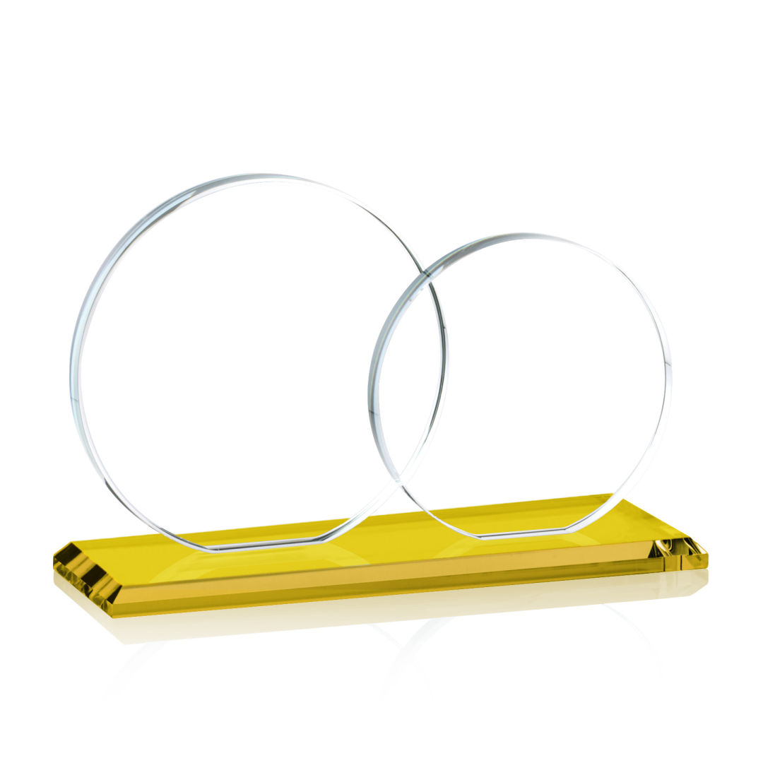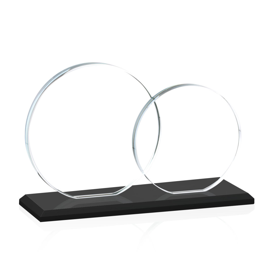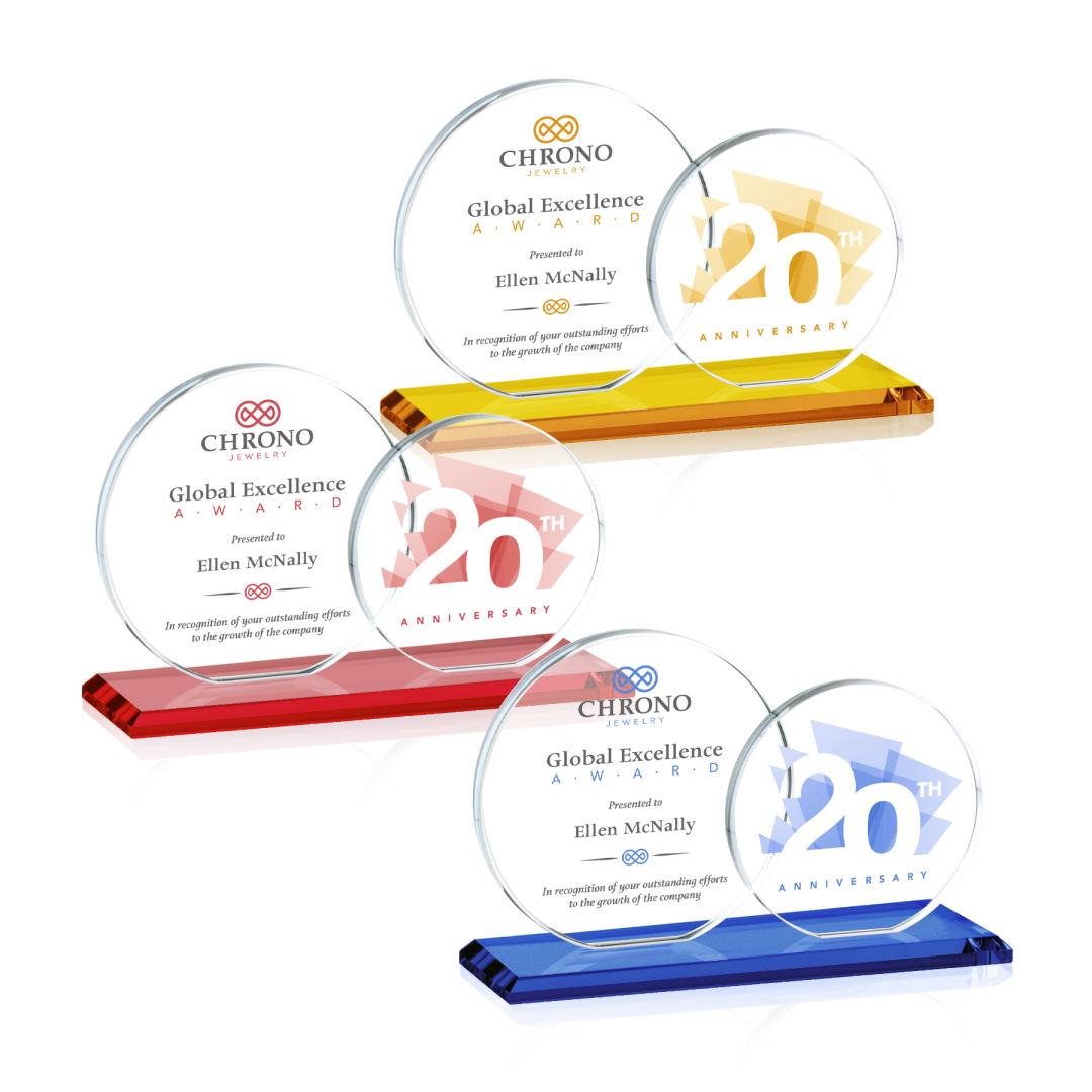 The Double Victoria Award features 2 opulent Starfire circles positioned on a dazzling Emerald Green, Sapphire Blue, Amber, Ebony, Ruby, White glass panel or albion base. Let your message POP with full color VividPrint! 8.0″ W x 5.125″ H x 3.0″ D