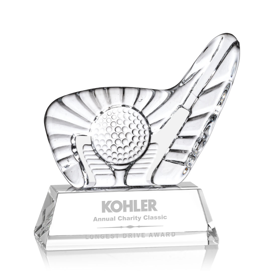 Stunning Thick Optical Crystal Iceberg shaped like a driver with a molded golf ball. Mounted on a 2″ Optical Base. Available in 3 sizes. 4.5″ H