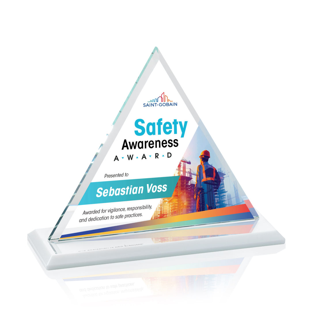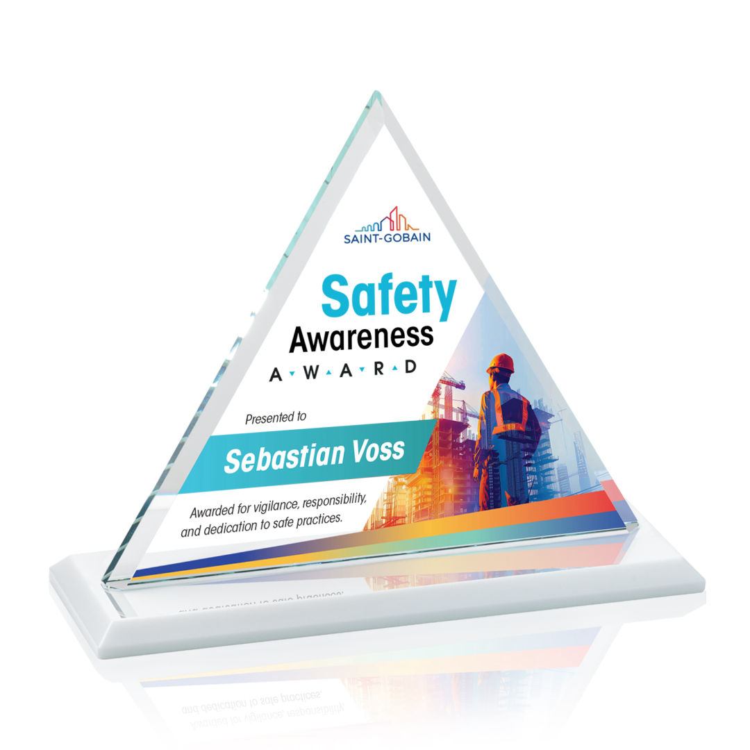 Our extraordinary Starfire triangle VividPrint™ award is combined with an optical crystal beveled base, the latest trend in designer glass, to update a classic look with chic style. Bring your artwork to life with full-color VividPrint™! 7.0″ W x 5.375″ H x 3.0″ D