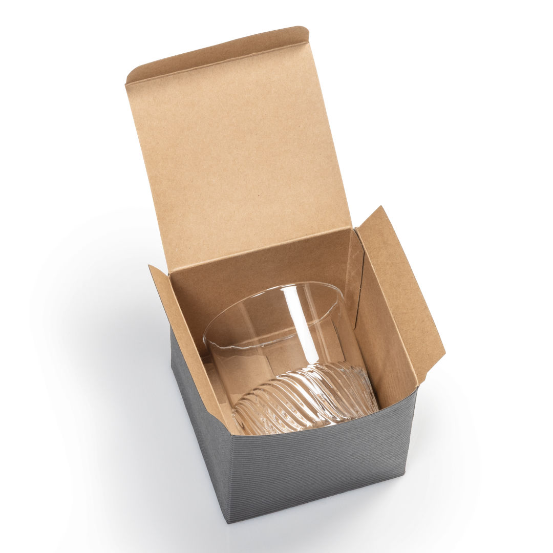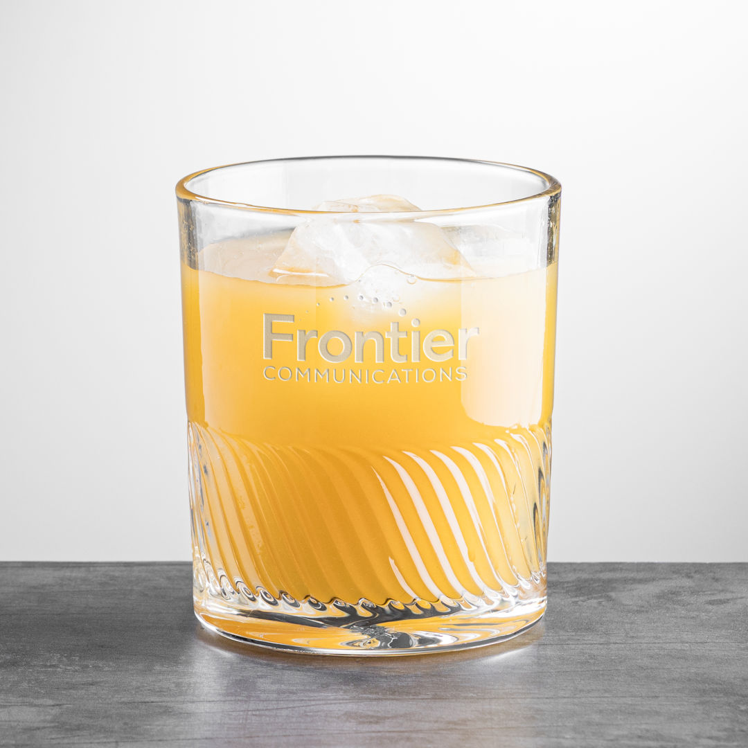 The crystalline Drysdale Double Old Fashioned Glass features a captivating wavy ribbed texture that wraps around the lower half, adding depth and dimension. Beneath, the design transforms into a mesmerizing swirl pattern at the base, creating a striking visual effect when viewed from above. 3.375″ W x 3.75″ H