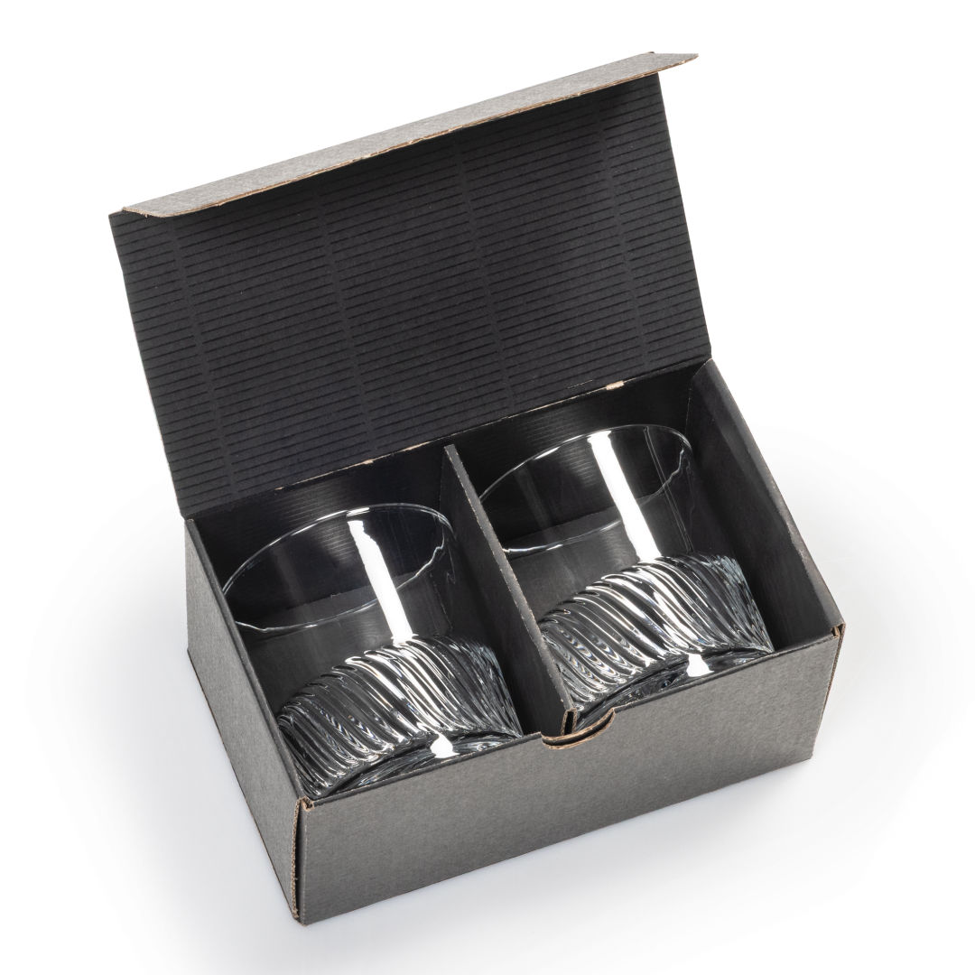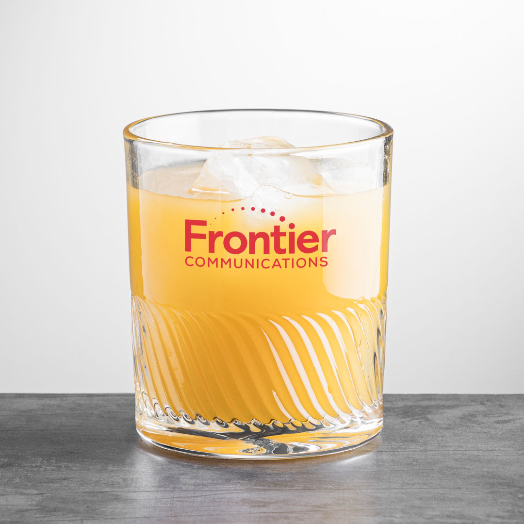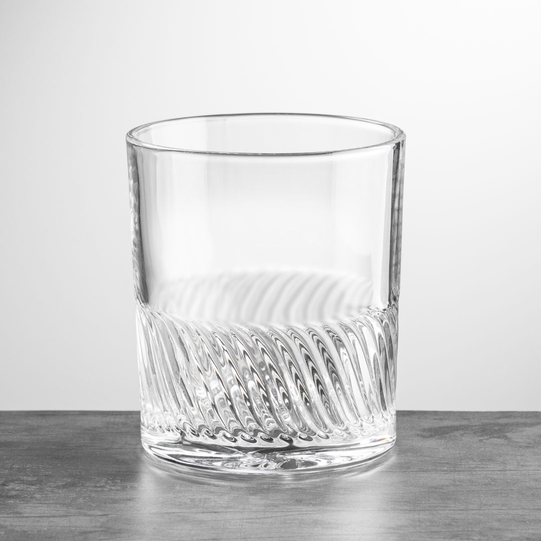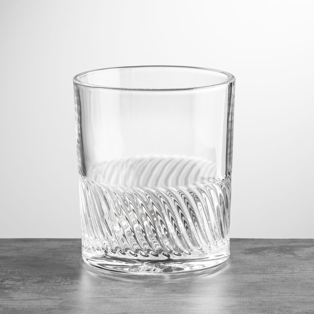 The Drysdale Double Old Fashioned Glass features a captivating wavy ribbed texture that wraps around the lower half, adding depth and dimension. Beneath, the design transforms into a mesmerizing swirl pattern at the base, creating a striking visual effect when viewed from above. 3.375″ W x 3.875″ H