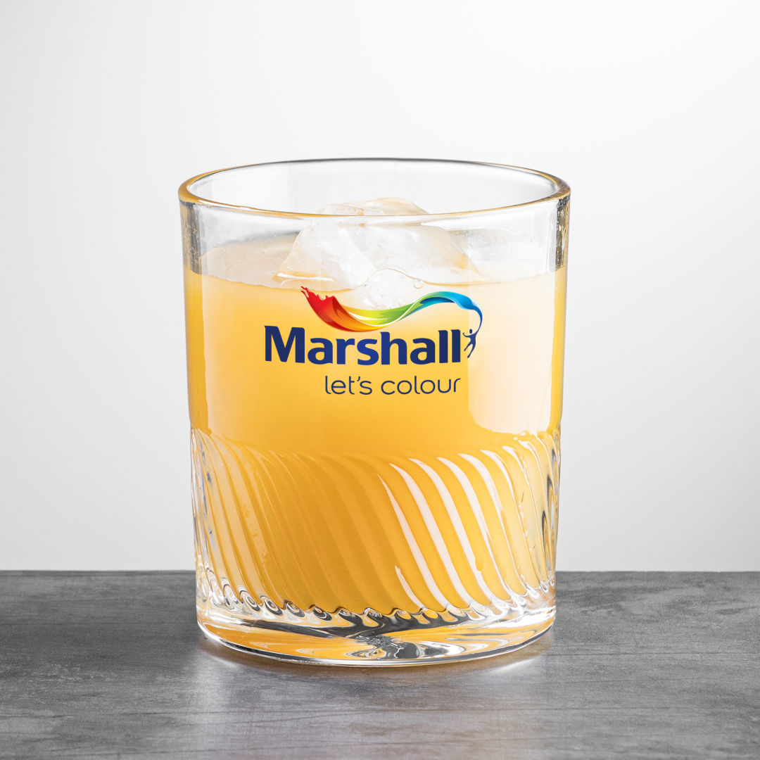 The Drysdale Double Old Fashioned VividPrint™ Glass features a captivating wavy ribbed texture that wraps around the lower half, adding depth and dimension. Beneath, the design transforms into a mesmerizing swirl pattern at the base, creating a striking visual effect when viewed from above. Enhance your artwork with full-color VividPrint™! 3.375″ W x 3.875″ H