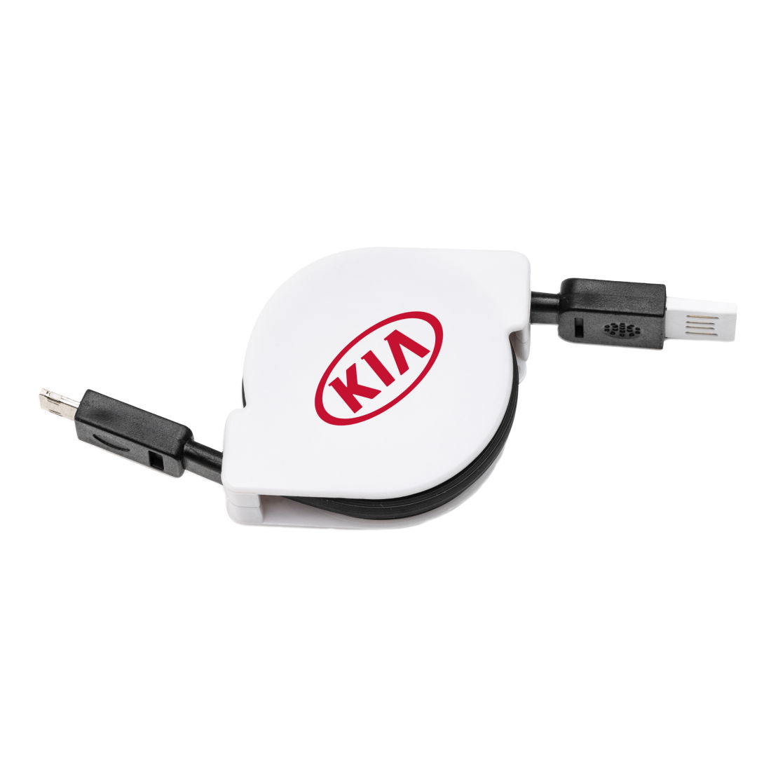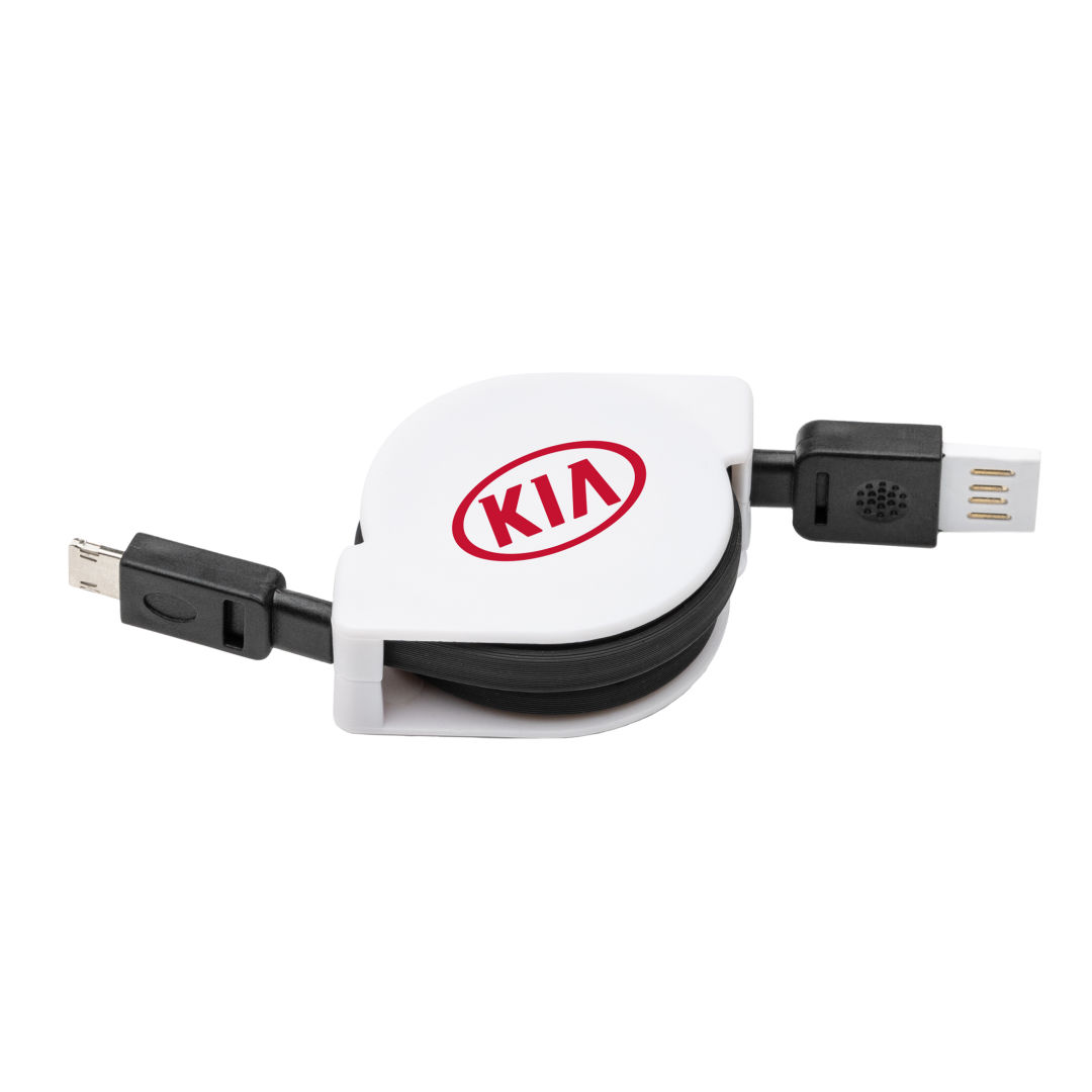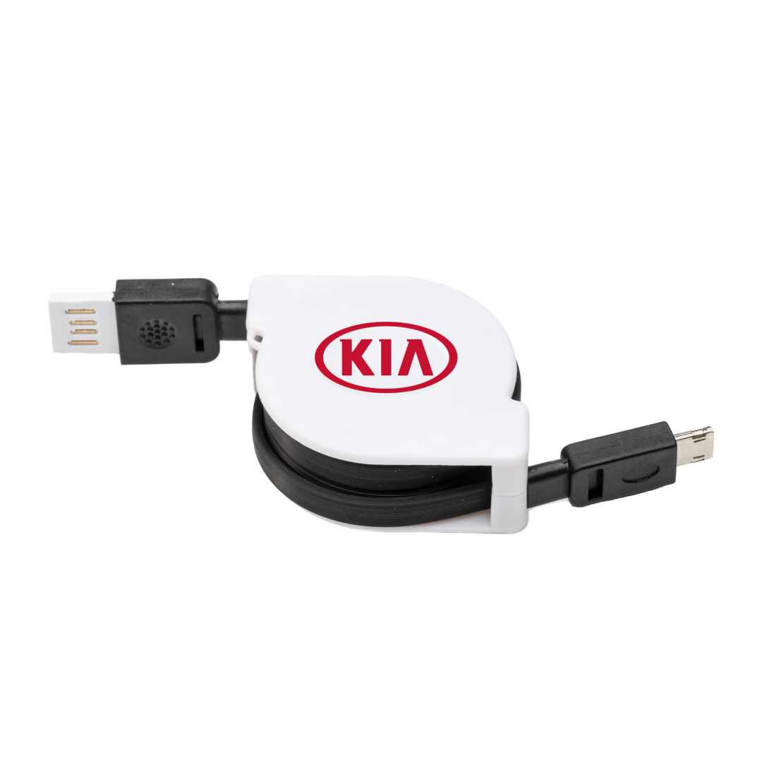 Compact retractable charging cable-Features a dual head Micro USB and 8 Pin-Compatible with both Apple and Android devices-Same cable charges both device types, 1 size fits all!Product Size: 1.625″ x 2.25″. 1.625″ W x 2.25″ H