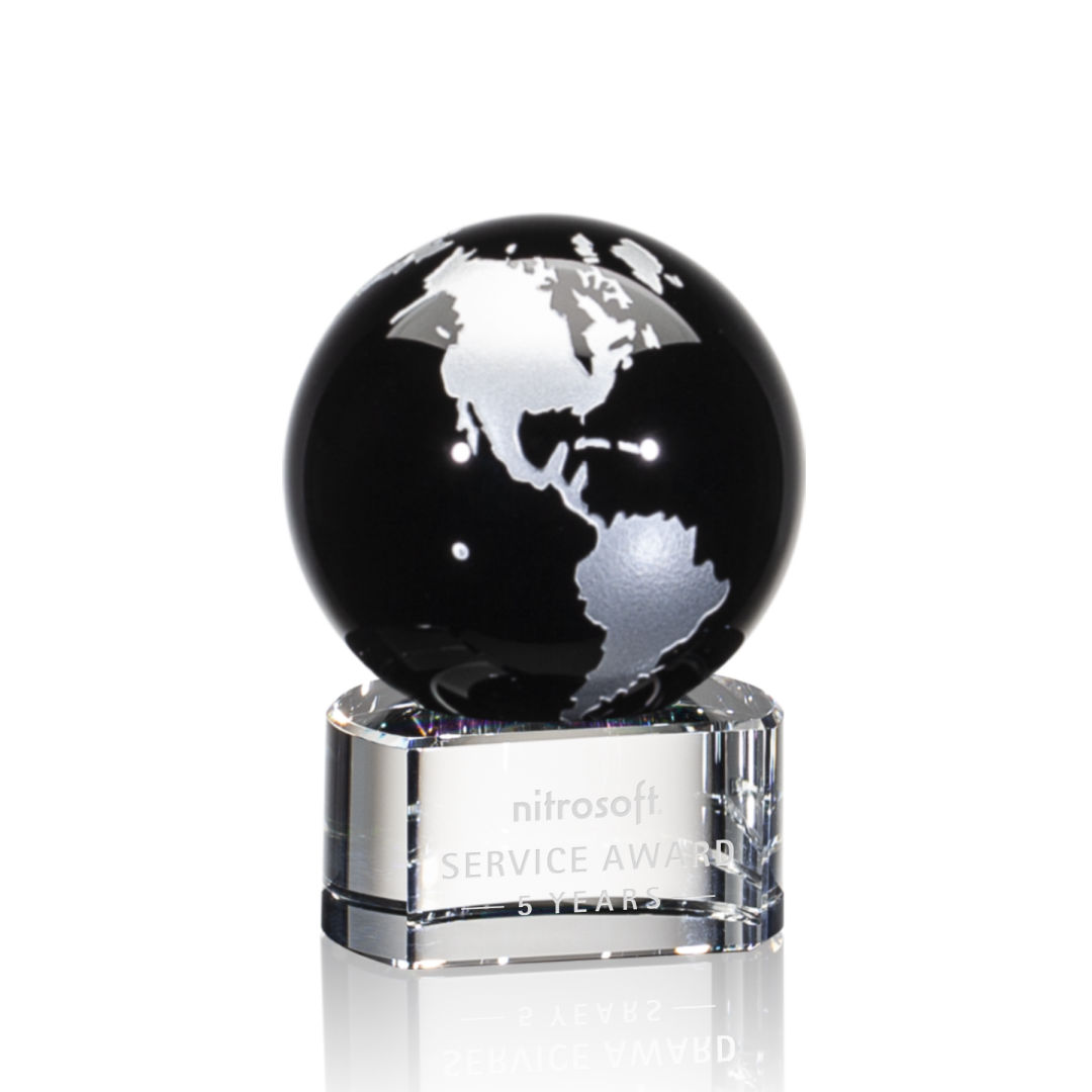 Stunning and Exquisite Globe Award features Gold or Silver filled continents floating in an ocean of emerald, sapphire or ebony crystal. Perched atop our Optical Crystal Paragon base. 2.375″ W x 4.875″ H