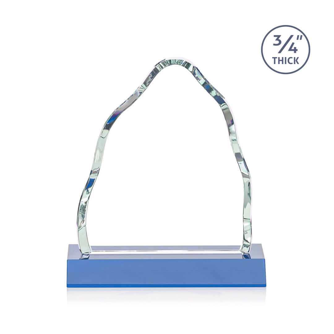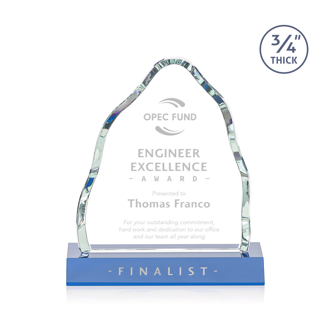 Climb the tallest mountain of recognition with the Dunwich Starfire Award. Mounted on a Sky Blue base, this thick beveled 3/4″ thick Starfire Crystal iceberg is the ultimate way to reward a momentous achievement. 2nd Position Etch Optional. 6.0″ W x 6.75″ H x 3.0″ D