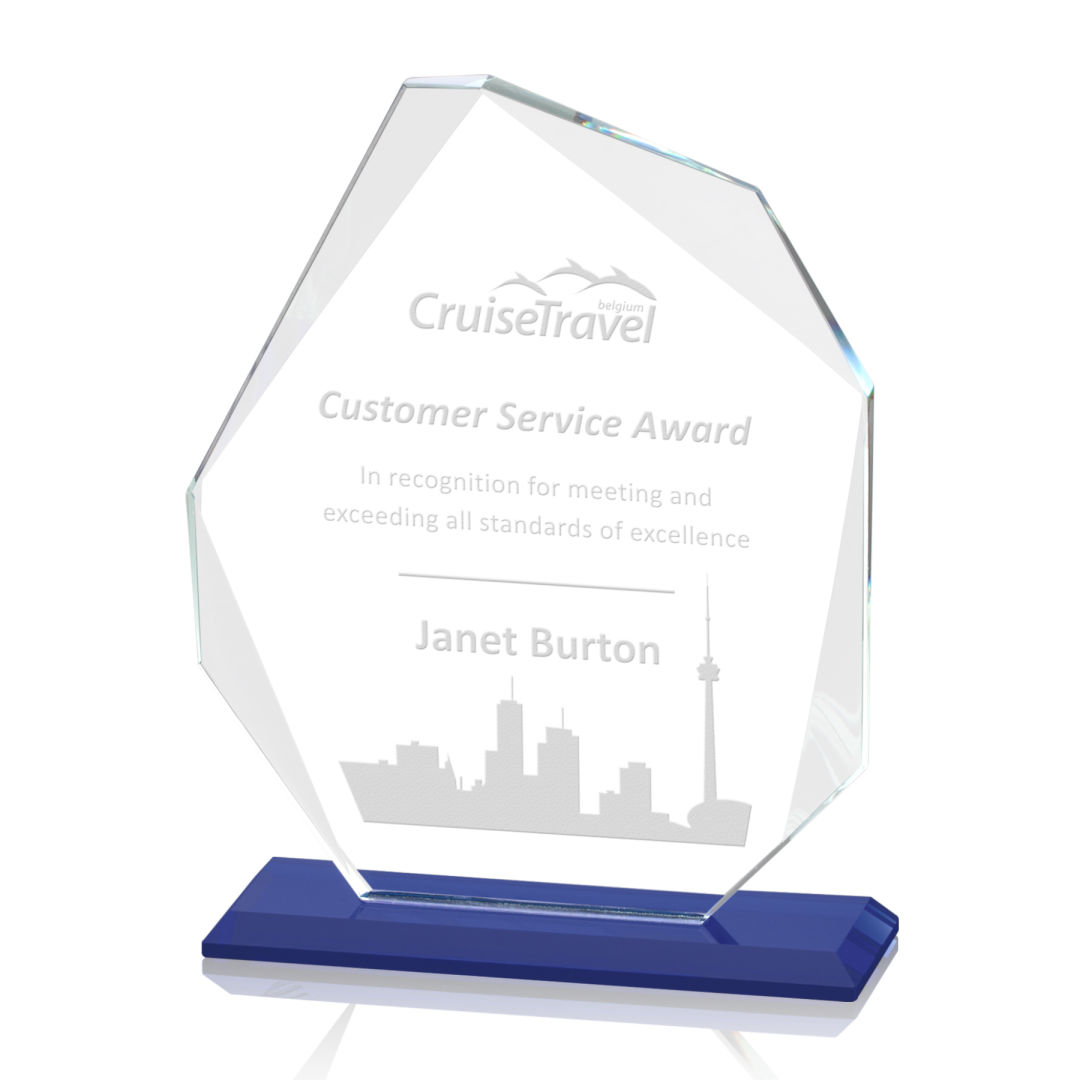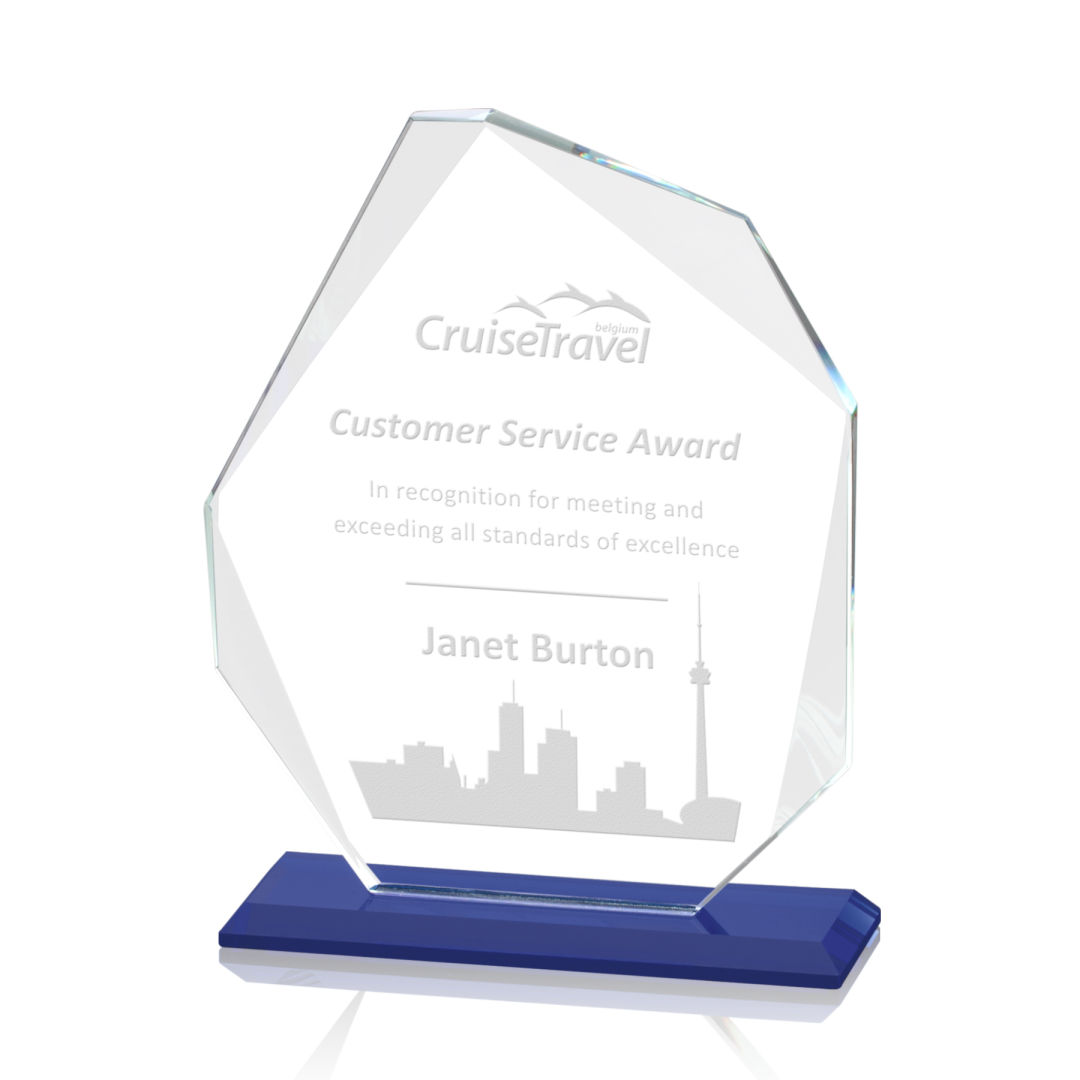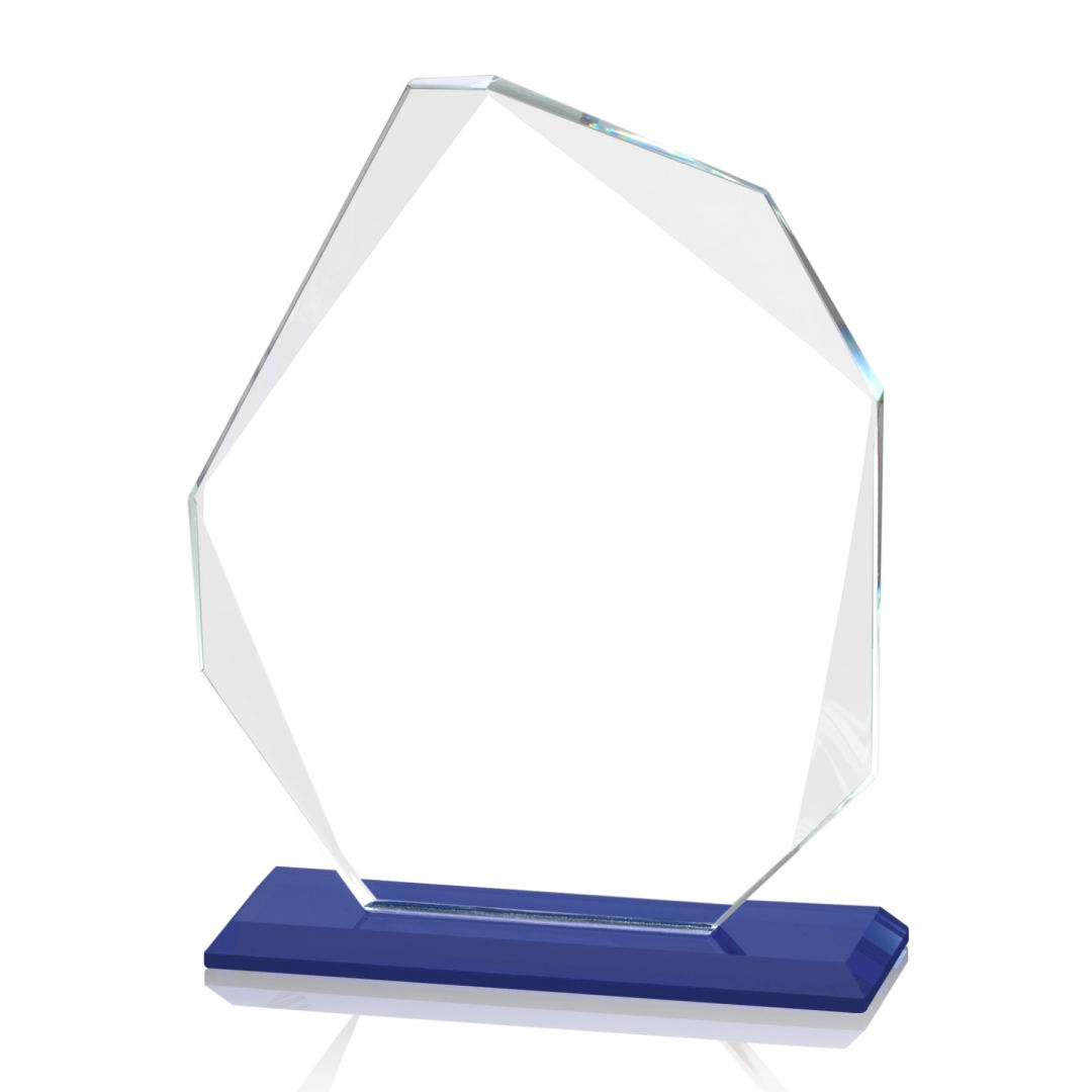 The beveled Durham is a dynamic starfire pentagon mounted on a blue base. 5.5″ W x 6.75″ H x 0.2″ D