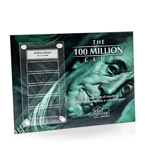The Dynamic Perpetual Award Plaque is an acrylic plaque with a raised clear acrylic plate attached to the front that holds 6 perpetual plates. This is a unique and budget friendly option for every awards program. This plaque is a standard wall size that measures 9″ x 12″. The satin silver metal perpetual plates measure 2.5″ w x 0.5″ h. NOTE: Published price includes decorated plaque, but DOES NOT include the 6 personalized plates. Prepay for all 6 plates at $20.00 (R) each, or pay for plates as needed for $25.00 (R) each. Plate prices include USPS shipping. 11.25″ H x 8.25″ W x 0.5″ D