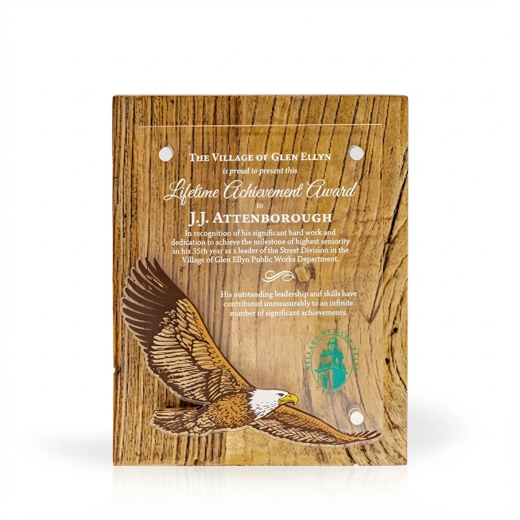 The Eagle Rustica Reclaimed Wood Award is more than just a trophy; it’s a testament to enduring accomplishment and responsible stewardship. Crafted from beautifully aged reclaimed wood, each 8″ x 10″ piece tells a unique story, featuring natural grain patterns and subtle imperfections that add character and authenticity. The majestic eagle motif, intricately integrated into the design, symbolizes vision, leadership, and the pursuit of excellence, making it an ideal recognition for exceptional individuals and teams.