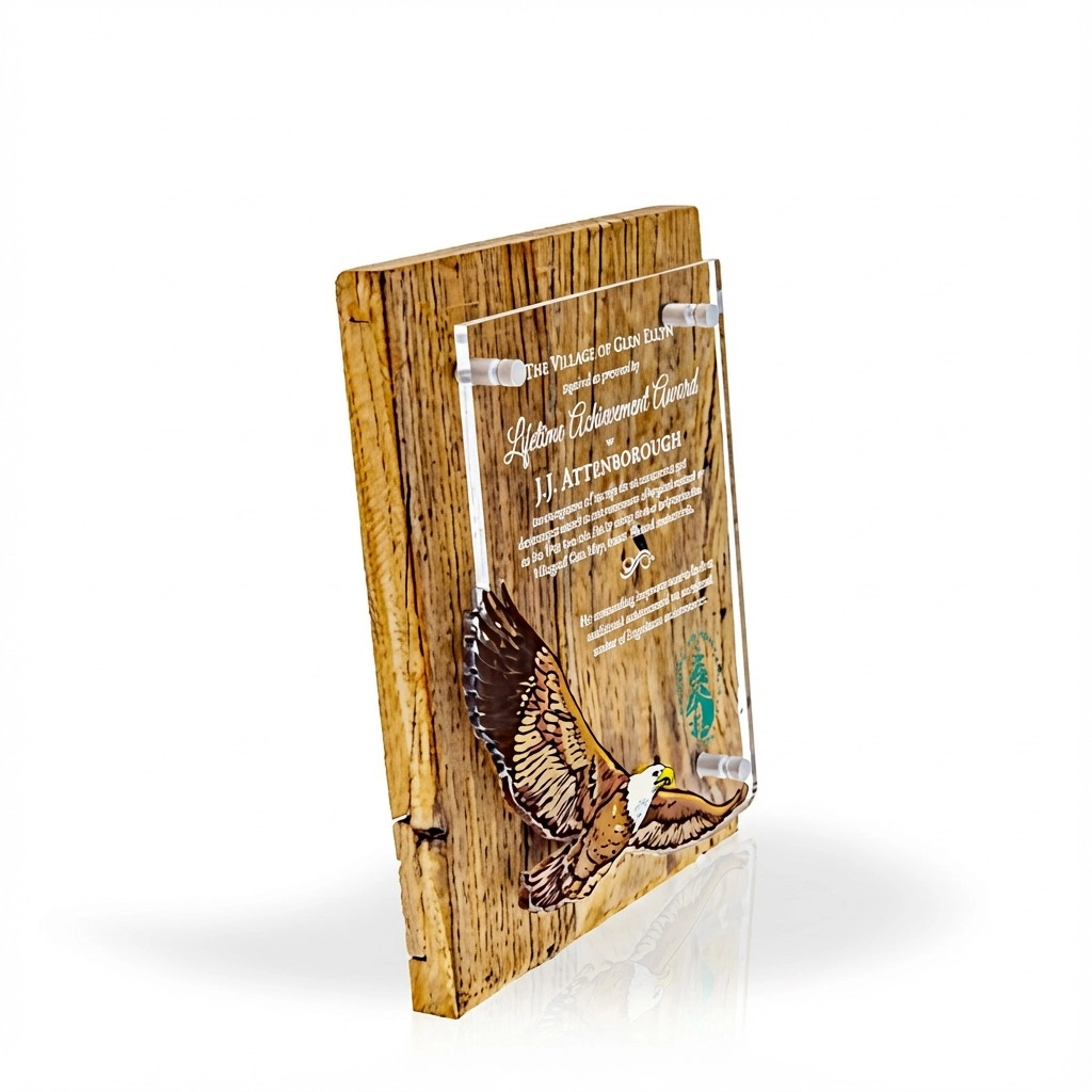 This award offers a distinguished and eco-conscious way to honor significant milestones. Its robust construction and natural aesthetic provide a sophisticated alternative to traditional awards, ensuring it will be proudly displayed and cherished for years to come. Perfect for corporate recognition programs, educational achievements, or community service awards, the Eagle Rustica elevates any commendation with its blend of rustic charm and profound symbolism.
