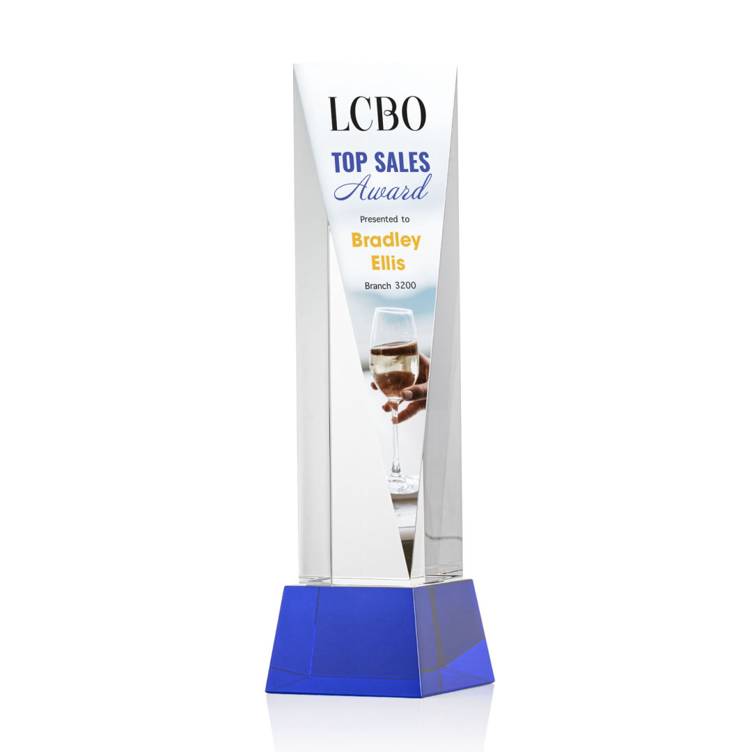 The Optical Crystal Easton VividPrint™ Award is a grand gesture of appreciation. This extraordinary award features an elongated triangular face with ample space for deep etching your message. Mounted on a sapphire square base. Second-position etch and colorfill are optional. Packaged in a black satin-lined presentation gift box. 3.0″ W x 6.0″ H x 3.0″ D