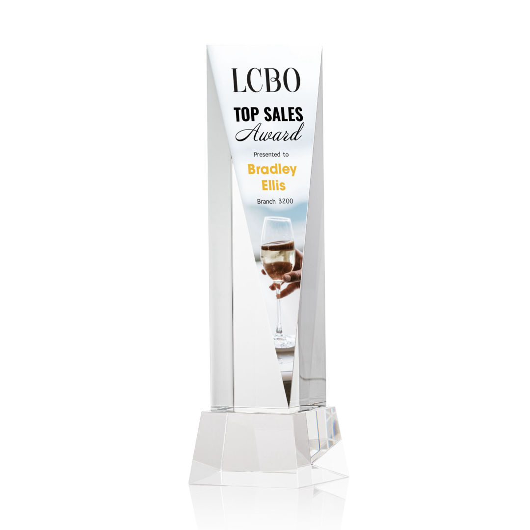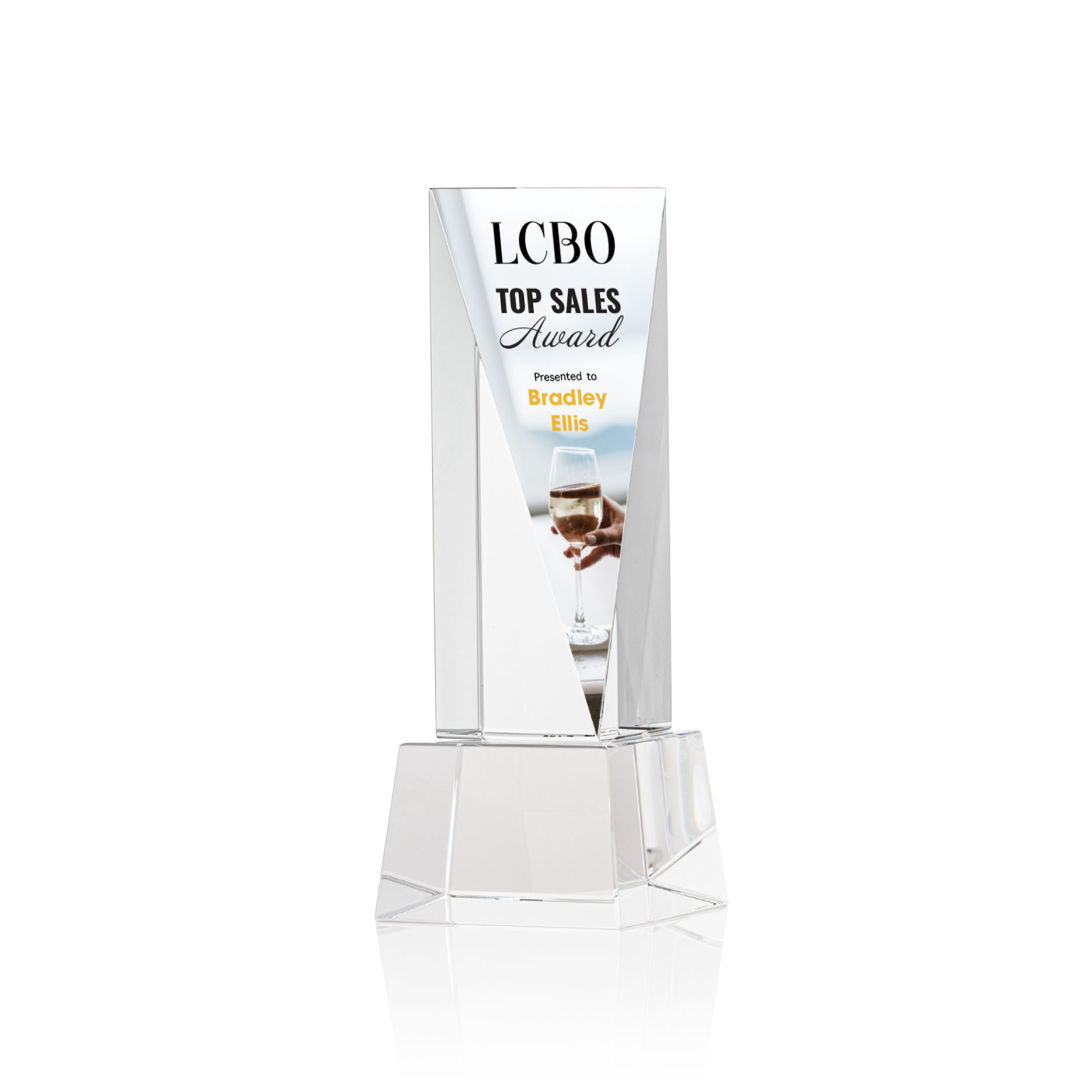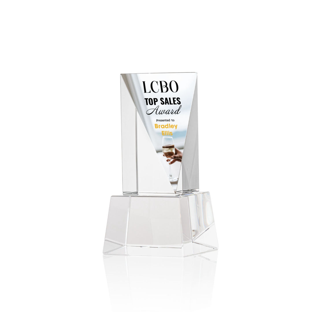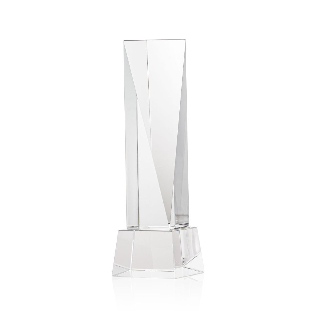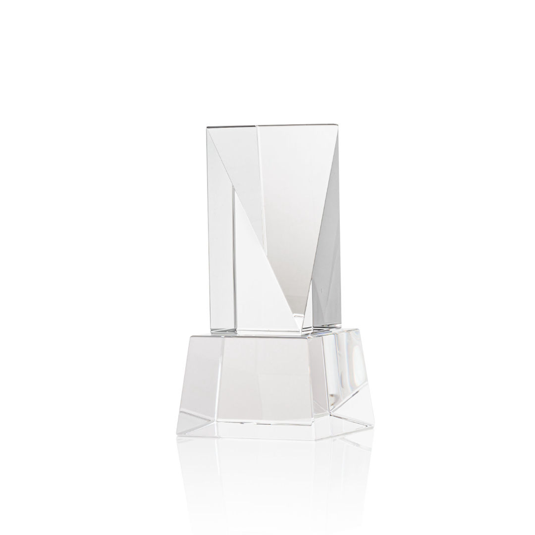 The Optical Crystal Easton VividPrint™ Award is a grand gesture of appreciation. This extraordinary award features an elongated triangular face with ample space for deep etching your message. Mounted on a square Optical Crystal base. Second-position etch and colorfill are optional. Packaged in a black satin-lined presentation gift box. 3.0″ W x 6.0″ H x 3.0″ D