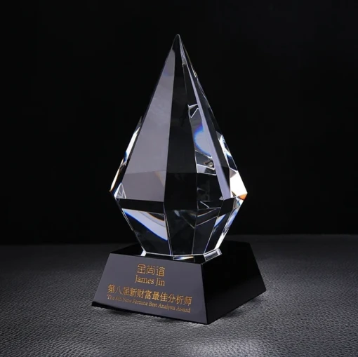 The Eclipse Pyramid Award with its multiple facets reflects light form every angle. It is attached to a Black Optic Crystal Base that is perfect for Abrasive Etching and colorful with either a Gold or Silver Color. It is available in 2 sizes and comes in a premium quality presentation box. 3.9″ L x 3.9″ W x 7.3″ H