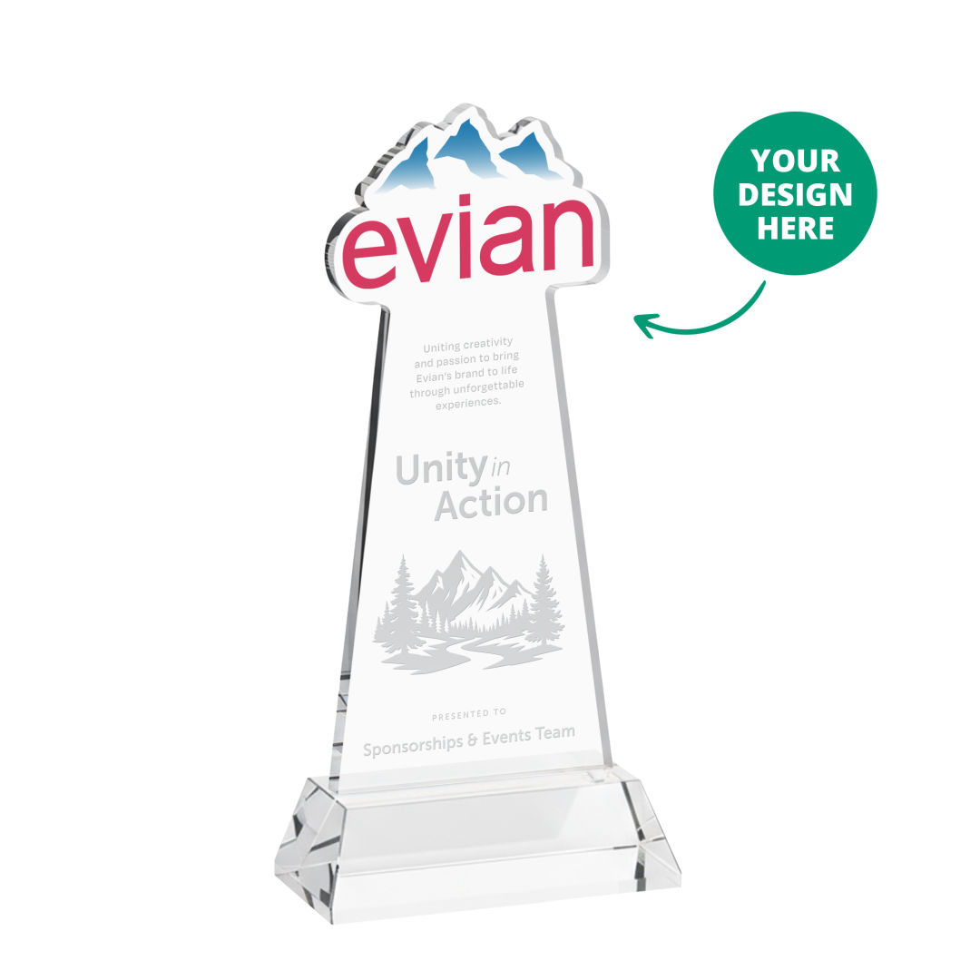 Custom awards made easy! The EdgeCraft Award transforms your logo or artwork into a signature one-of-a-kind crystal piece, making personalized recognition both impactful and effortless. Crafted from brilliant Starfire Crystal, each award features a personalized cut-out top shaped to your design—ideal for logos, product designs, emblems, crests, and much more. Whether you’re creating a single standout award or building an entire program, the EdgeCraft delivers unmatched flexibility with a minimum order quantity of just one piece. The only limitation is your imagination!Designed for both large and small recognition programs, the EdgeCraft Award gives you unmatched control over cost and consistency. Buy in advance to lock in current pricing and avoid fluctuations from tariffs or economic shifts. And with the significant savings offered at higher quantities, it’s easy to maximize your budget while securing everything you need upfront. We store your awards for free, then decorate and ship t. 4.0″ W x 8.0″ H x 1.75″ D