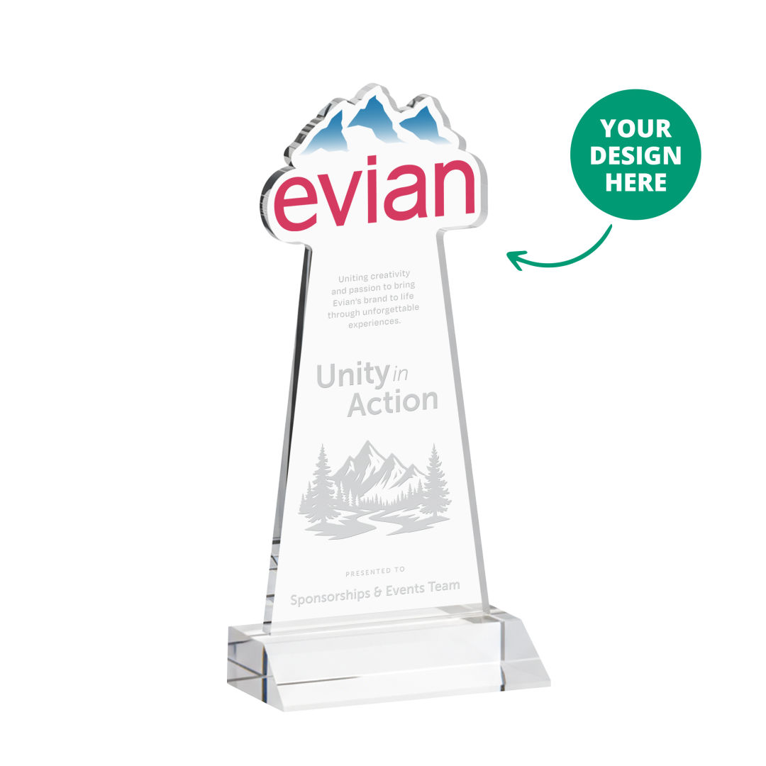 Custom awards made easy! The EdgeCraft Award transforms your logo or artwork into a signature one-of-a-kind crystal piece, making personalized recognition both impactful and effortless. Crafted from brilliant Starfire Crystal, each award features a personalized cut-out top shaped to your design, ideal for logos, product designs, emblems, crests, and much more. Whether you’re creating a single standout award or building an entire program, the EdgeCraft delivers unmatched flexibility with a minimum order quantity of just one piece. The only limitation is your imagination!Designed for both large and small recognition programs, the EdgeCraft Award gives you unmatched control over cost and consistency. Buy in advance to lock in current pricing and avoid fluctuations from tariffs or economic shifts. And with the significant savings offered at higher quantities, it’s easy to maximize your budget while securing everything you need upfront. We store your awards for free, then decorate and ship . 4.0″ W x 7.75″ H x 3.0″ D