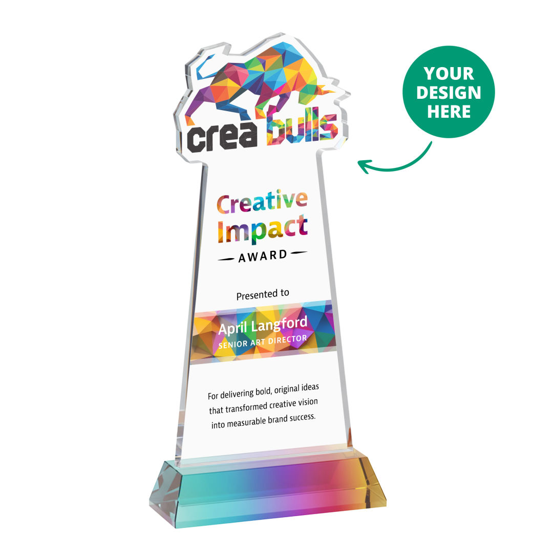 Custom awards made easy! The EdgeCraft Award transforms your logo or artwork into a signature one-of-a-kind crystal piece, making personalized recognition both impactful and effortless. Crafted from brilliant Starfire Crystal, each award features a personalized cut-out top shaped to your design—ideal for logos, product designs, emblems, crests, and much more. Whether you’re creating a single standout award or building an entire program, the EdgeCraft delivers unmatched flexibility with a minimum order quantity of just one piece. The only limitation is your imagination!Designed for both large and small recognition programs, the EdgeCraft Award gives you unmatched control over cost and consistency. Buy in advance to lock in current pricing and avoid fluctuations from tariffs or economic shifts. And with the significant savings offered at higher quantities, it’s easy to maximize your budget while securing everything you need upfront. We store your awards for free, then decorate and ship t. 4.0″ W x 8.0″ H x 1.75″ D