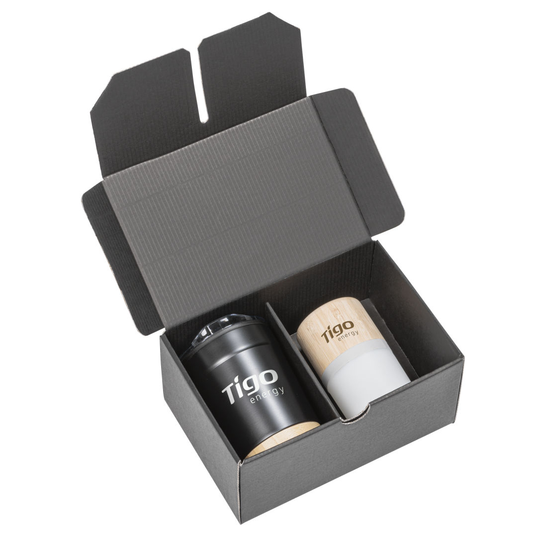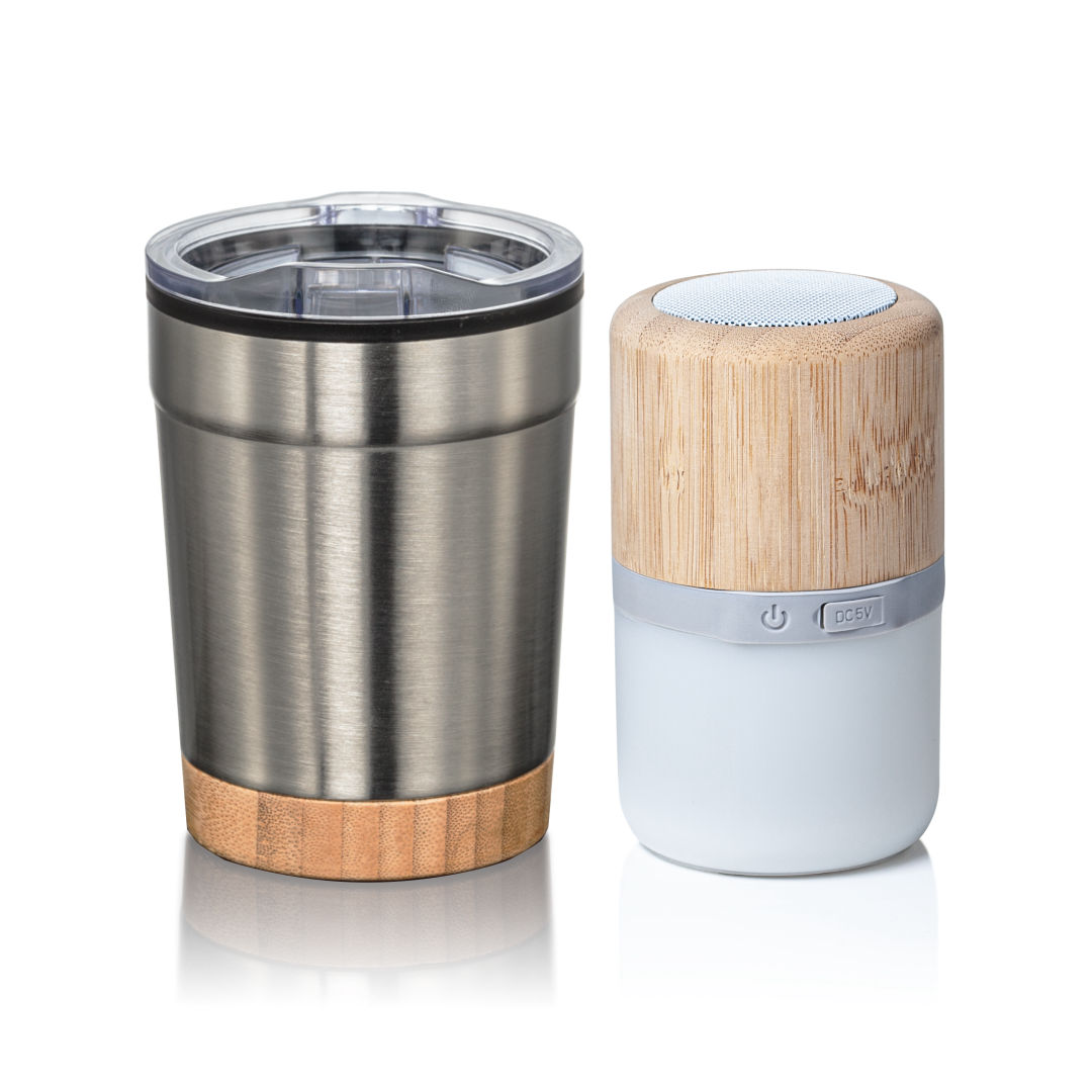 This charming gift set includes our popular Eduardo Double Walled 12oz Tumbler, paired with our Bluesy multi-colored speaker. The Bamboo base on the tumbler and the bamboo exterior of the speaker are perfect compliments and create a highly functional gift set that will be cherished for years to come. A great way to promote your brand or message.
