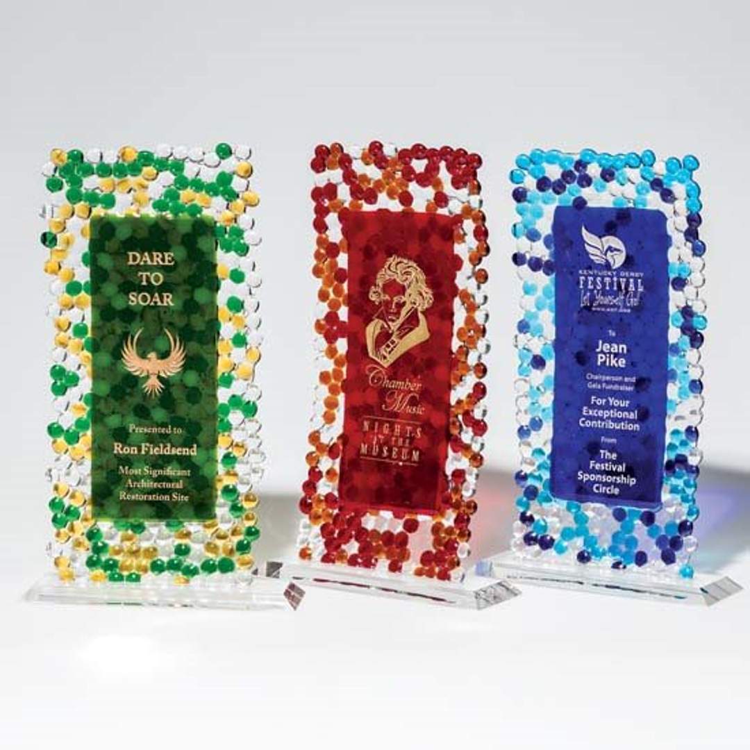 Intricate drops of art glass are individually fired and then combined in this expressive, sparkling award reminiscent of the effervescent bubbles in a glass of champagne. Choose from emerald/amber, cobalt/aqua or ruby/carnelian art glass mounted to a beveled starfire base.1 Colorfill Included. 9.0″ W x 15.0″ H x 3.0″ D