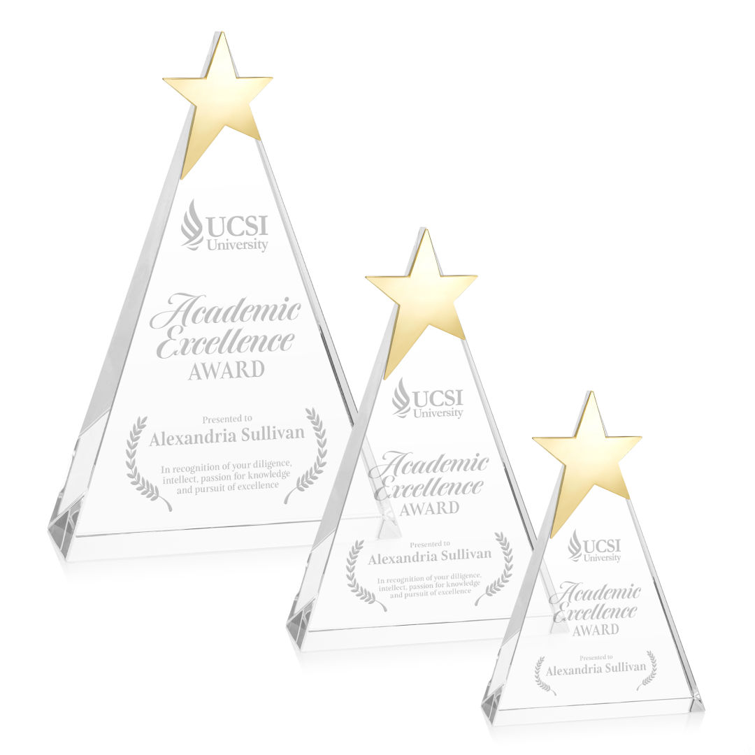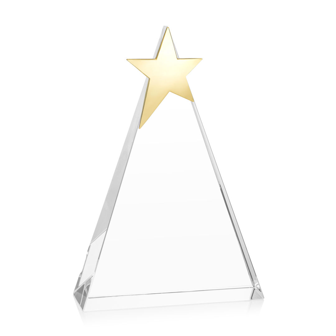 The freestanding Eglington Star Award features a sleek optical crystal body in a refined triangular shape, crowned with a brilliant gold star. Its crisp lines and sparkling clarity create a modern design that symbolizes excellence and achievement. Available in three sizes, this award is perfect for tiered recognition programs or celebrating accomplishments at every level. 4.0″ W x 6.0″ H x 1.75″ D