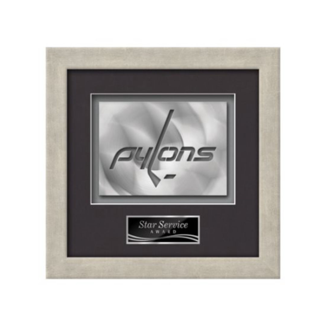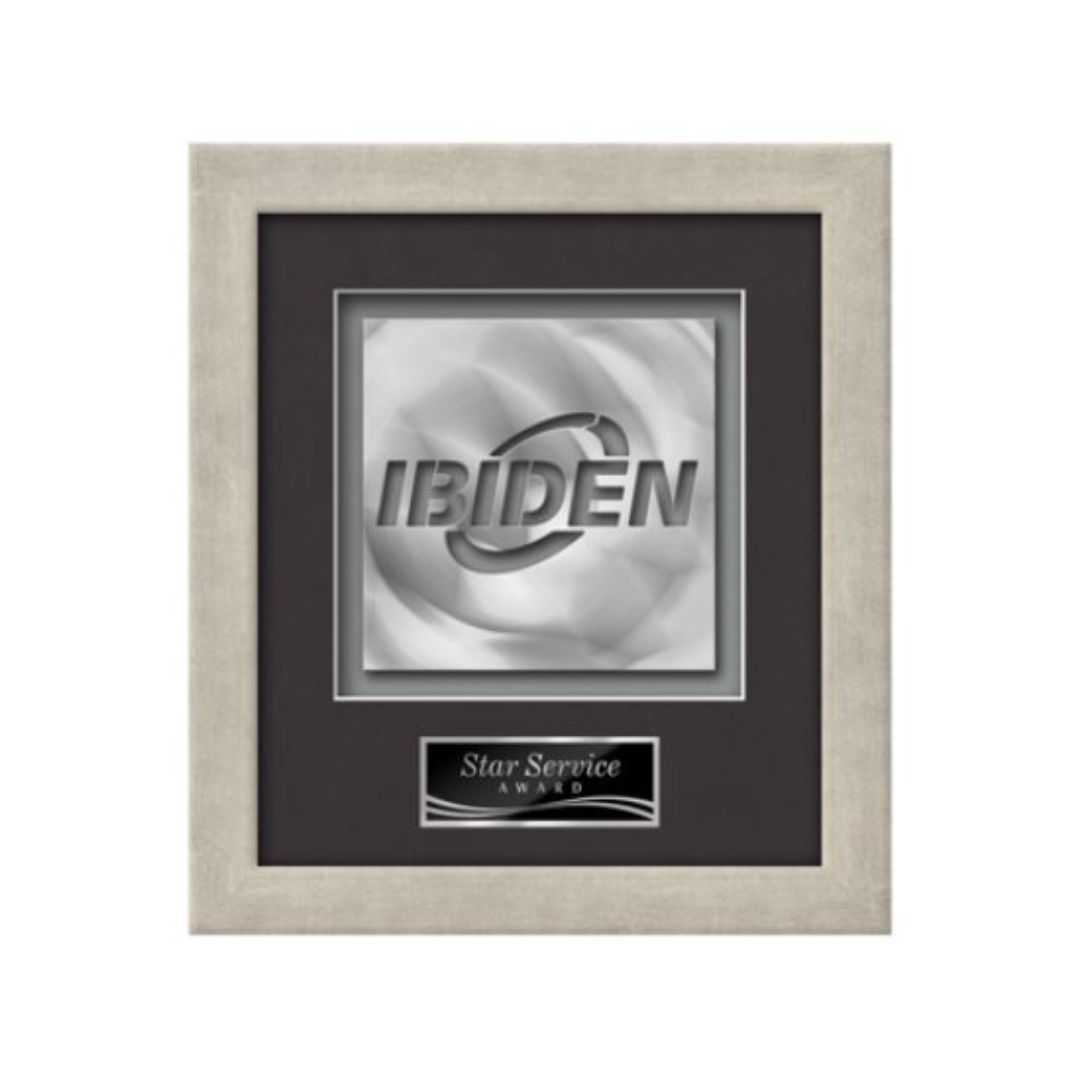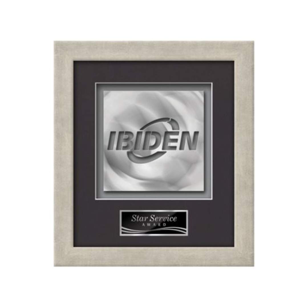 Elevate your brand to a gallery quality work of art with our proprietary AquaShaping™ process. Using a block of solid brushed aluminum, our technology cuts a dramatic contemporary rendition of your logo from solid metal. The dimensional sculpture is mounted in our Eldridge presentation frame and paried with your choice of 2 standard mattes and a personalization plate. 11.0″ W x 11.0″ H