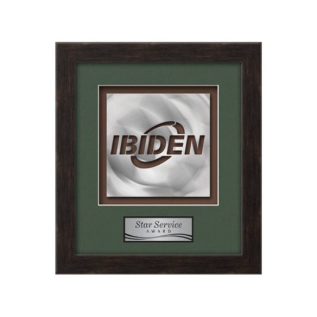 Elevate your brand to a gallery quality work of art with our proprietary AquaShapingâ„¢ process. Using a block of solid brushed aluminum, our technology cuts a dramatic contemporary rendition of your logo from solid metal. The dimensional sculpture is mounted in our Eldridge presentation frame and paried with your choice of 2 standard mattes and a personalization plate. 11.0″ W x 11.0″ H