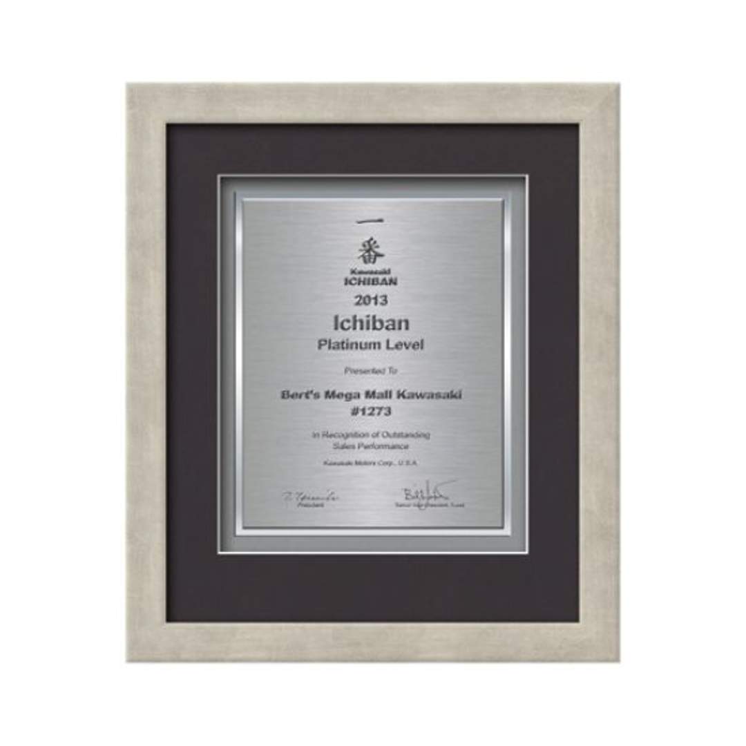 Commemorate a milestone achievement with Waterleaf Studios’ Certificate collection. Honor years of service, display diplomas, service awards, company mission statements, mergers & acquisitions or extraordinary achievements with these impressive statements of accomplishment. Your words of recognition are reproduced using our polished edged Double Plated TexEtch process with your choice of 2 standard mattes and framed in our museum quality Eldridge molding. 15.5″ W x 14.0″ H