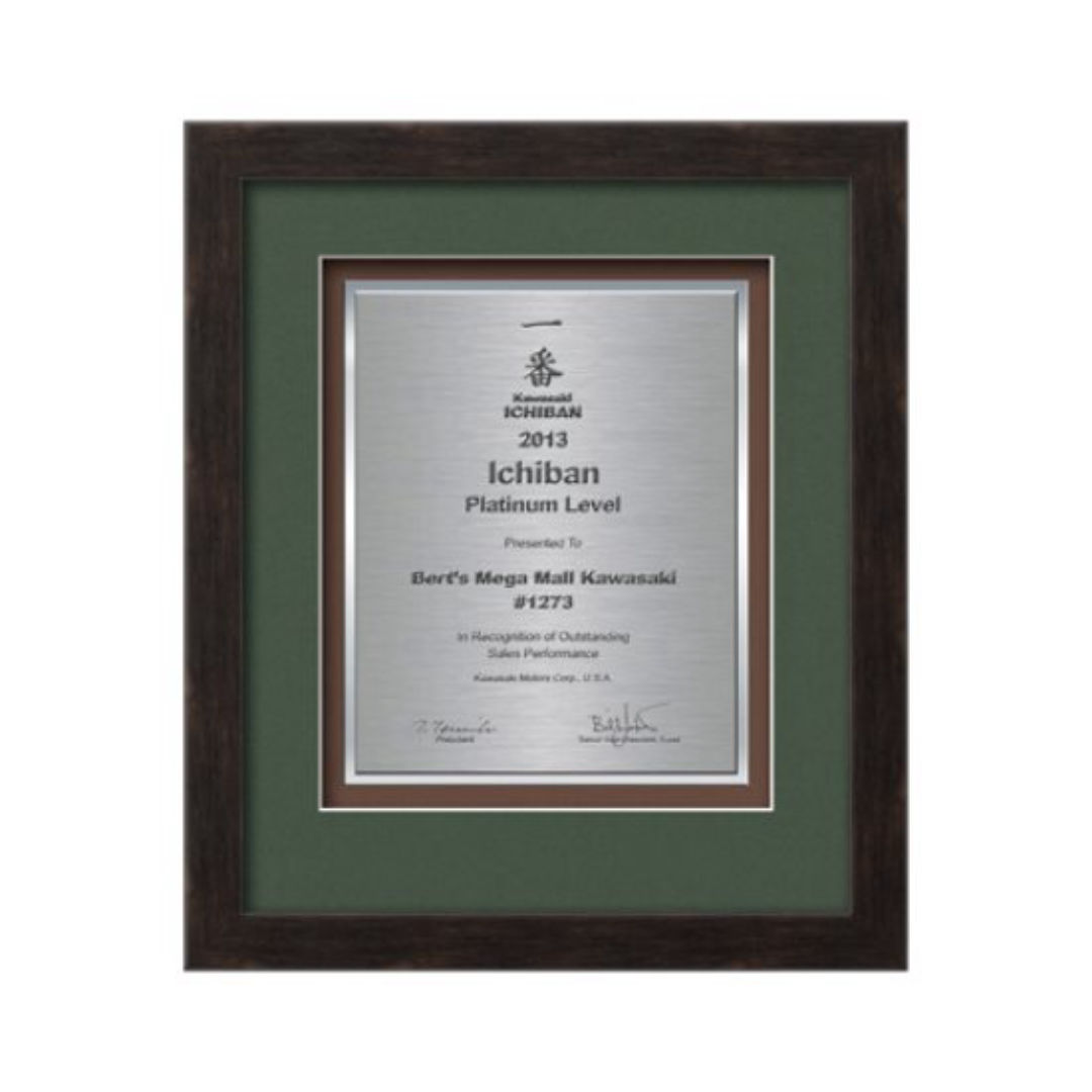 Commemorate a milestone achievement with Waterleaf Studios’ Certificate collection. Honor years of service, display diplomas, service awards, company mission statements, mergers & acquisitions or extraordinary achievements with these impressive statements of accomplishment. Your words of recognition are reproduced using our polished edged Double Plated TexEtch process with your choice of 2 standard mattes and framed in our museum quality Eldridge molding. 15.5″ W x 14.0″ H