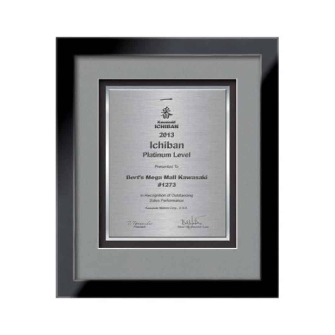 Commemorate a milestone achievement with Waterleaf Studios’ Certificate collection. Honor years of service, display diplomas, service awards, company mission statements, mergers & acquisitions or extraordinary achievements with these impressive statements of accomplishment. Your words of recognition are reproduced using our polished edged Double Plated TexEtch process with your choice of 2 standard mattes and framed in our museum quality Eldridge molding. 15.5″ W x 14.0″ H