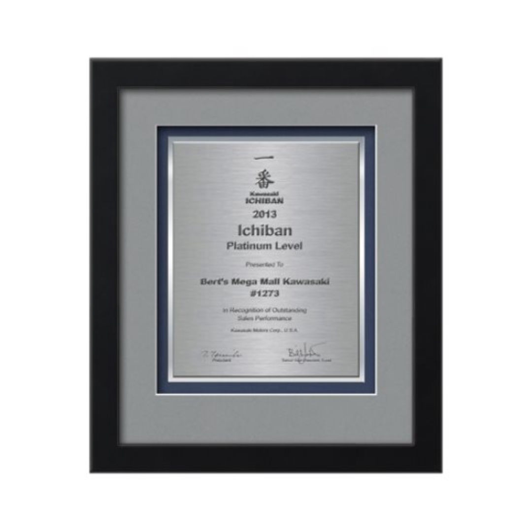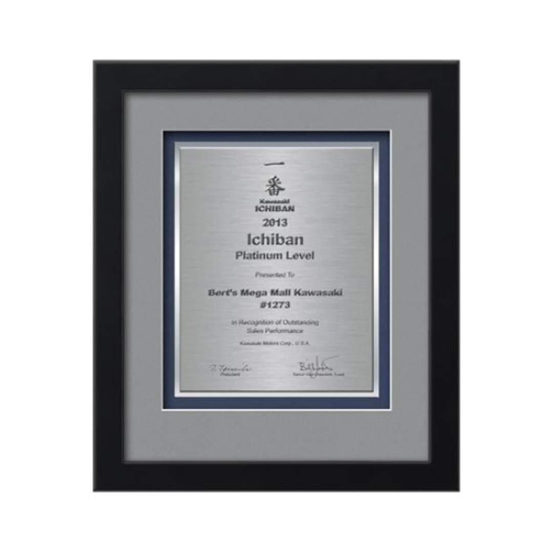 Commemorate a milestone achievement with Waterleaf Studios’ Certificate collection. Honor years of service, display diplomas, service awards, company mission statements, mergers & acquisitions or extraordinary achievements with these impressive statements of accomplishment. Your words of recognition are reproduced using our polished edged Double Plated TexEtch process with your choice of 2 standard mattes and framed in our museum quality Eldridge molding. 15.5″ W x 14.0″ H