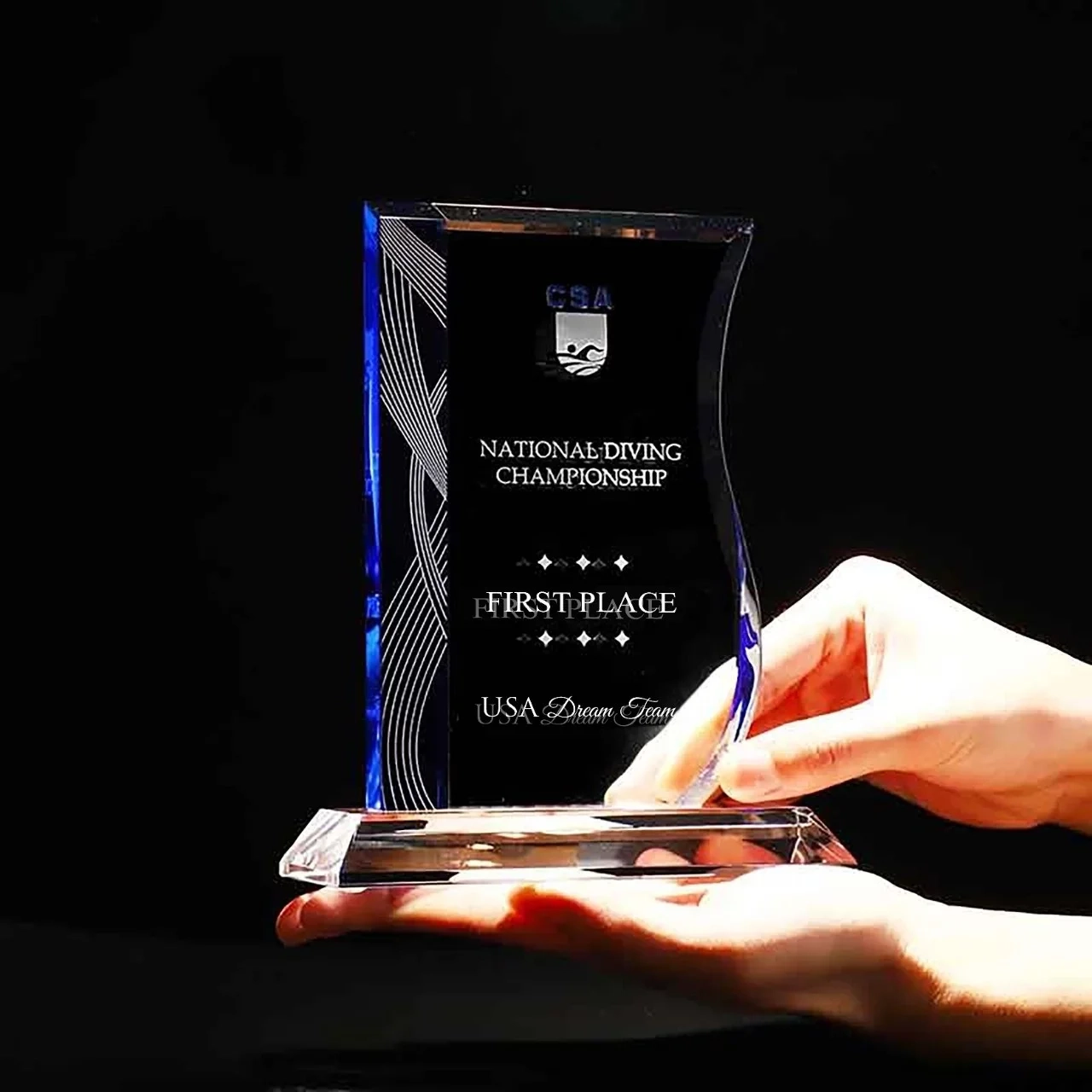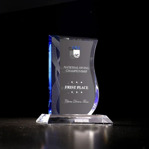 The Elegance Blue Award combines Clear Optic Crystal with a Blue Crystal accent strip and comes with a Clear Optic Crystal Base. Each Elegance Award is shipped in a premium quality presentation box. These awards are available as a blank for engravers, or if you prefer we can do the engraving for you. 5.5″ W x 6.7″ H x 0.6″ D