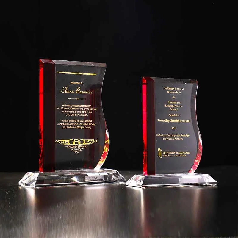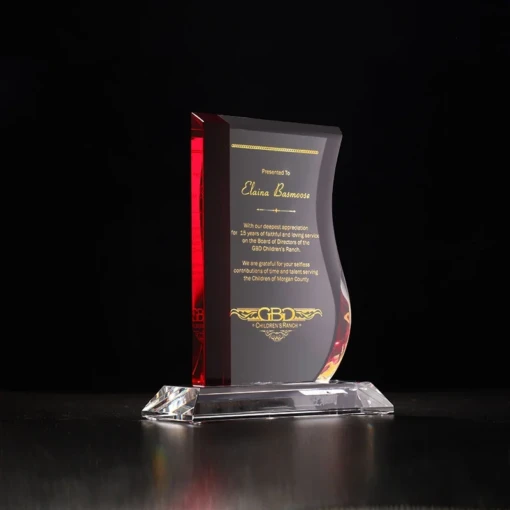 The Elegance Red Award combines Clear Optic Crystal with a Red Crystal accent strip. The Clear Optic Crystal Base and each Elegance Award is shipped in a premium quality presentation box. These awards are available as a blank for engravers, or if you prefer we can do the engraving for you. 5.5″ W x 6.7″ H x 0.6″ D