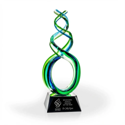 The Elizabeth Art Glass Award embodies sophisticated achievement, offering a visually striking and memorable tribute to extraordinary accomplishments. Crafted from premium art glass, each award boasts a unique, captivating form that catches and reflects light beautifully, ensuring it stands out as a focal point of any display. The elegant black base provides a strong, contemporary foundation, perfectly complementing the translucent beauty of the glass and adding a touch of refined gravitas to this exceptional piece.
