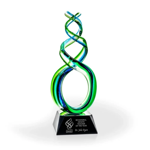 The Elizabeth Art Glass award is a popular award choice for companies with logos that use the blue and green colors. This award is set on a black clipped square crystal base, and the text will be silver filled for readability. Art glass awards are hand blown, and each piece will be slightly different in color, shape, and size. Bubbles and swirls are a part of the process and are considered normal and acceptable. 14″ H x 5.5″ W x 4.5″ D