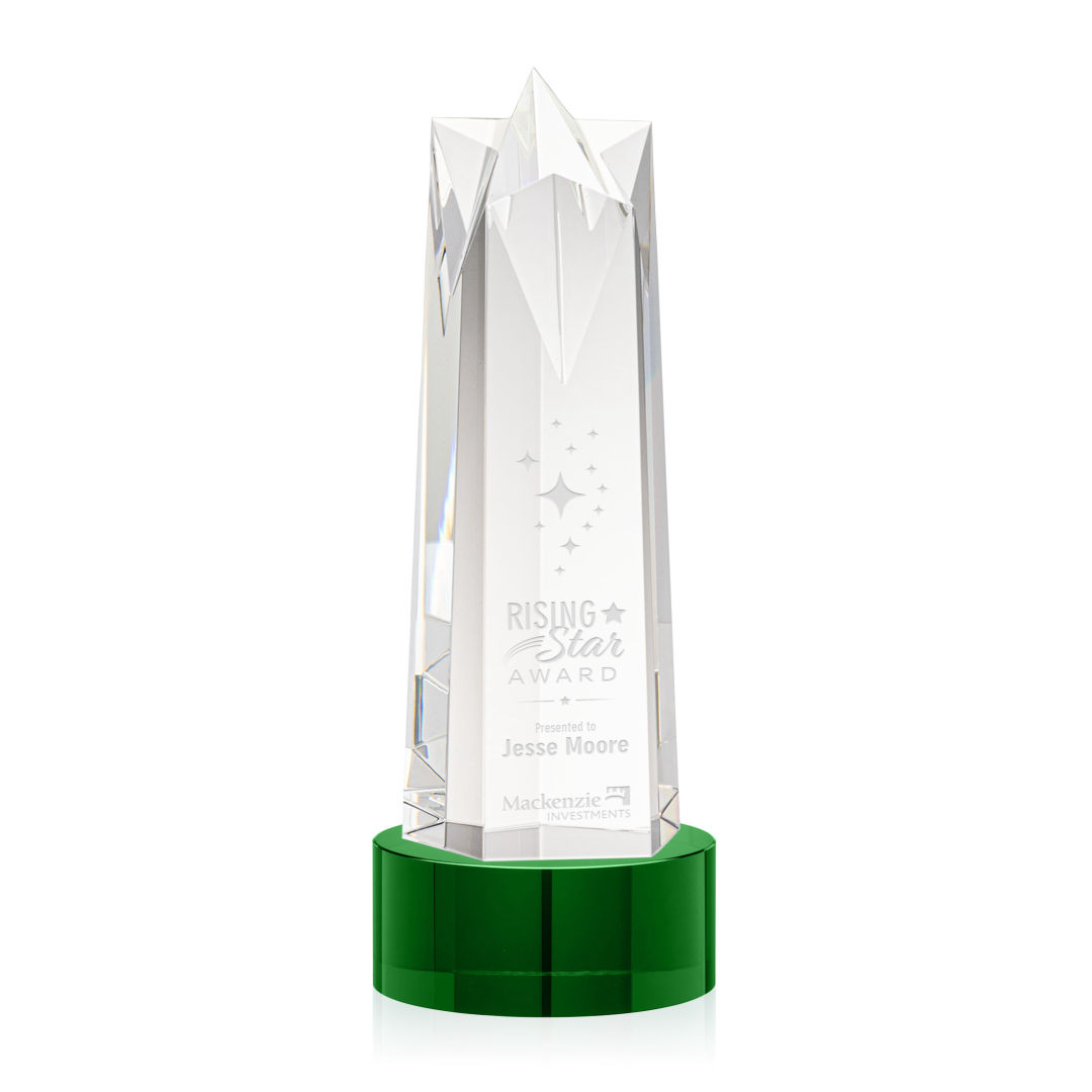 The Ellesmere Star Obelisk on Base is a stunning piece of recognition artistry crafted from Optical Crystal. Crowning this exquisite award is a flat star face, meticulously cut and polished to perfection. Its flat surface serves as a canvas for personalized engraving, allowing for a bespoke touch that commemorates the recipient’s remarkable success. Complete with a Clear, Emerald, Ebony, or Sapphire Optical Crystal Base. 2nd Position Etch Optional. 4.5″ W x 12.0″ H x 4.5″ D