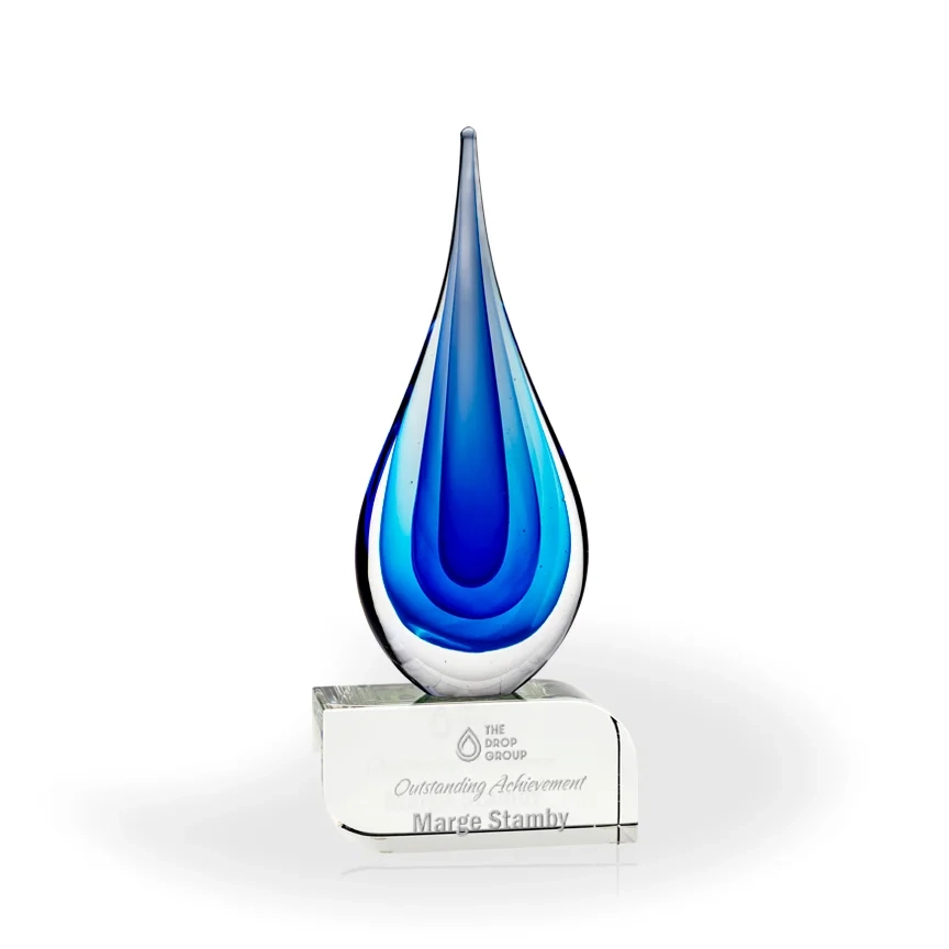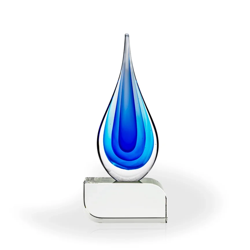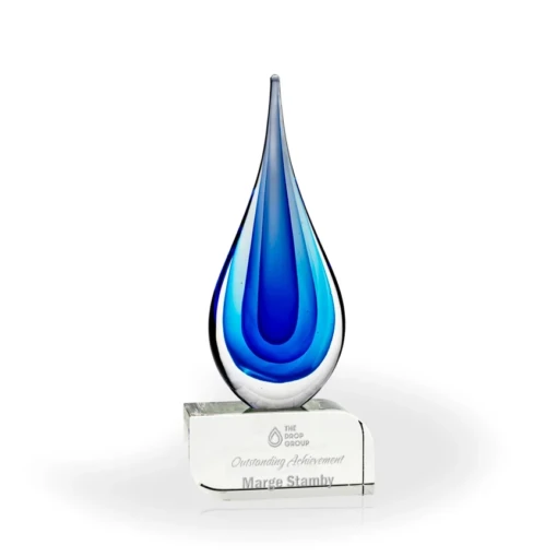 The Elston Art Glass Award is designed with three eye-catching shades of blue, and sits atop a clear crystal base. It’s shape resembles a raindrop or water droplet. Art glass adds unique and colorful award options to your recognition program. Art glass awards are hand blown, and each piece will be slightly different in color, shape, and size. Bubbles and swirls are a part of the process and are considered normal and acceptable. 12.25″ H x 5″ W x 2.5″ D