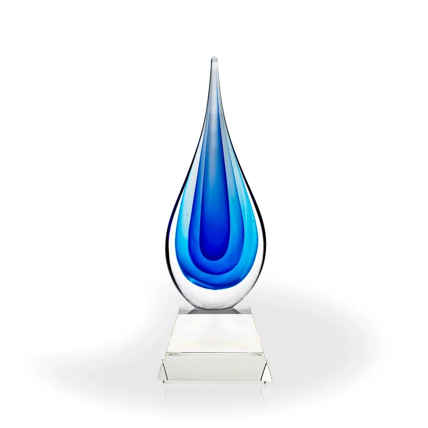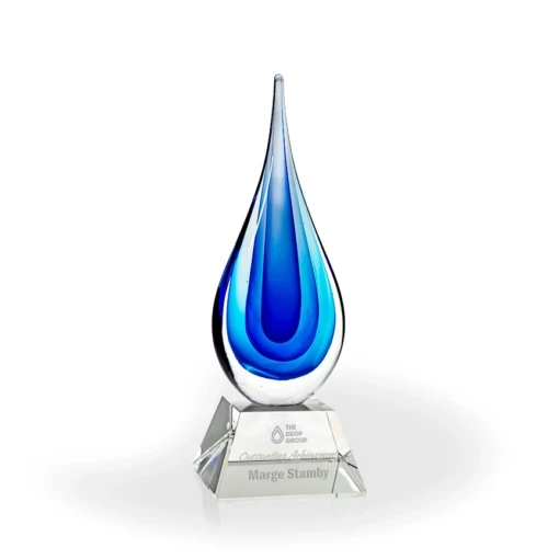 The Elston Art Glass Award is designed with three eye-catching shades of blue, and sits atop a clear crystal base. It’s shape resembles a raindrop or water droplet. Art glass adds unique and colorful award options to your recognition program. Art glass awards are hand blown, and each piece will be slightly different in color, shape, and size. Bubbles and swirls are a part of the process and are considered normal and acceptable. 12.75″ H x 4.5″ W x 4.5″ D