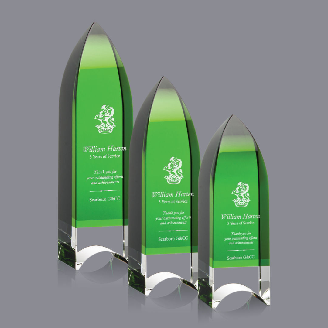 The large rectangular emerald optical crystal tower curves to a graceful peak with a clear crystal inlaid base and tip. This stunning piece creates a distinctive glow, perfect for a dramatic stage acceptance. 7.5″ H