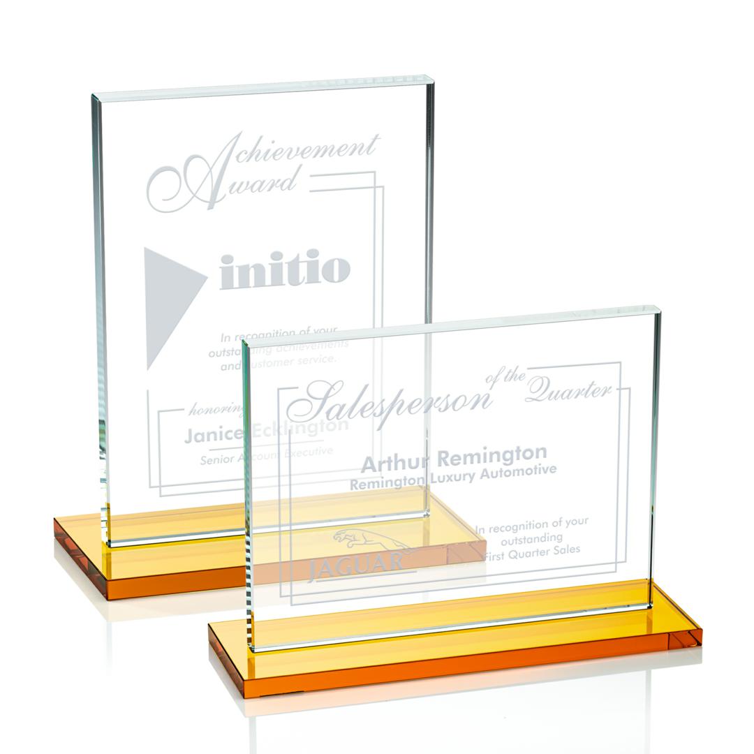 The Emperor Award is a simple yet elegant 0.5″ thick Starfire Crystal rectangle upright mounted vertical or horizontal on a amber crystal base. An ideal award featuring a large decorating area to recognize a significant achievement. Available with other bases, see associated items. 7.0″ W x 4.375″ H x 3.0″ D