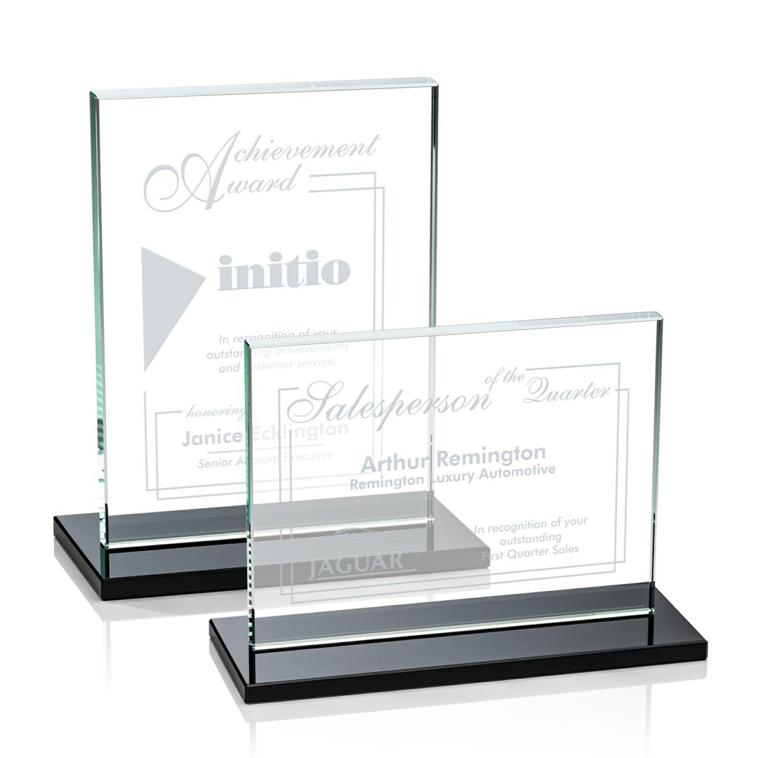 The Emperor Award is a simple yet elegant 0.5″ thick Starfire Crystal rectangle upright mounted vertical or horizontal on an ebony crystal base. An ideal award featuring a large decorating area to recognize a significant achievement. Available with other bases, see associated items. 7.0″ W x 4.375″ H x 3.0″ D