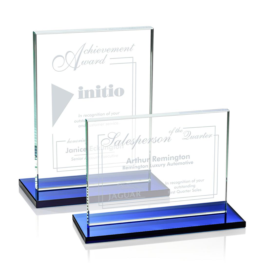 The Emperor Award is a simple yet elegant 0.5″ thick Starfire Crystal rectangle upright mounted vertical or horizontal on a blue crystal base. An ideal award featuring a large decorating area to recognize a significant achievement. Available with other bases, see associated items. 7.0″ W x 4.375″ H x 3.0″ D