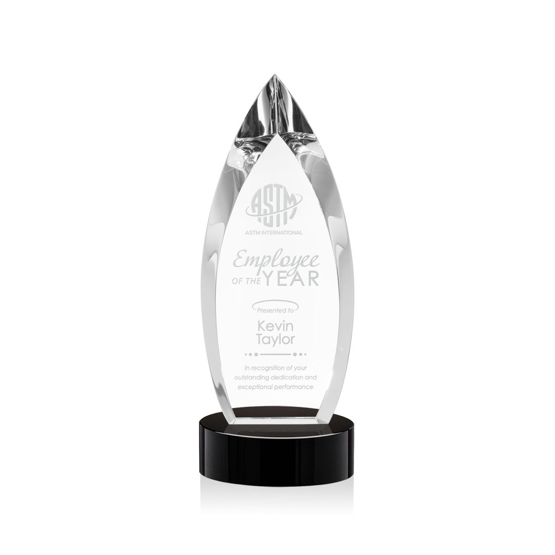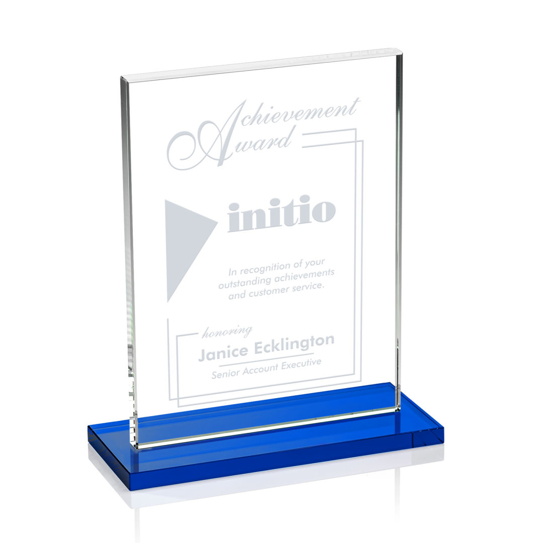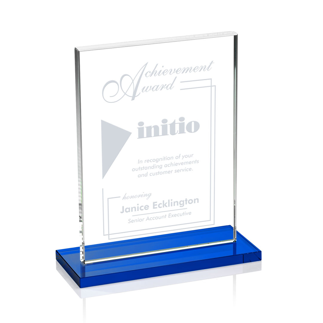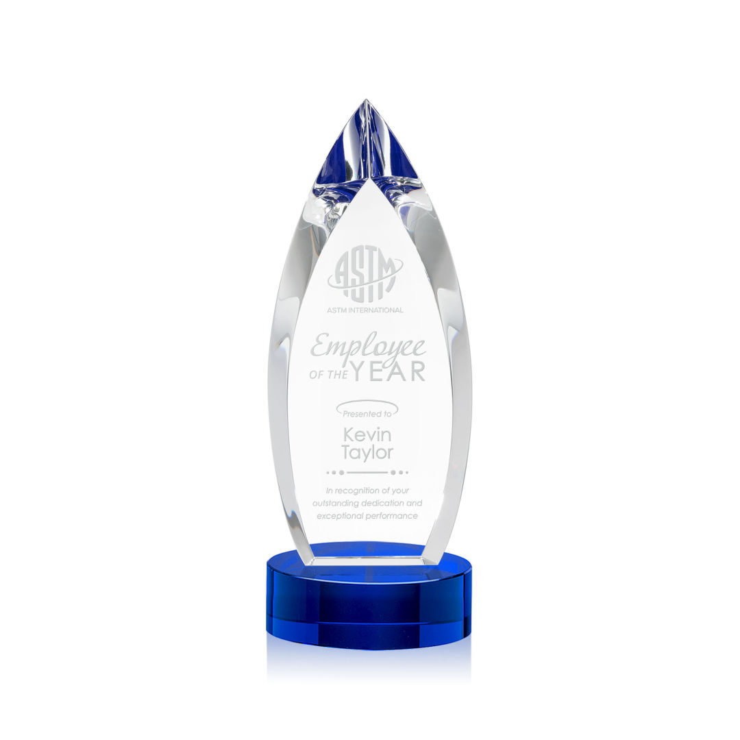 The Emperor Award is a simple yet elegant 0.5″ thick Starfire Crystal rectangle upright mounted vertical or horizontal on a blue crystal base. An ideal award featuring a large decorating area to recognize a significant achievement. 5.0″ W x 6.375″ H x 3.0″ D