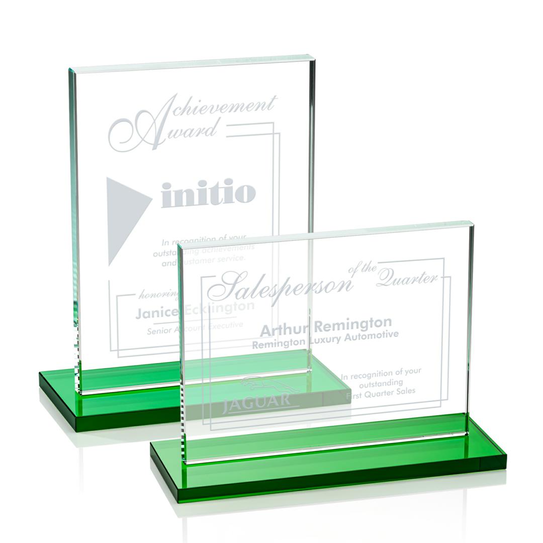 The Emperor Award is a simple yet elegant 0.5″ thick Starfire Crystal rectangle upright mounted vertical or horizontal on a emerald crystal base. An ideal award featuring a large decorating area to recognize a significant achievement. 7.0″ W x 4.375″ H x 3.0″ D