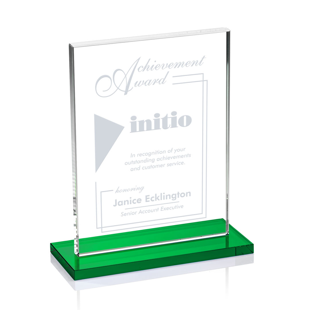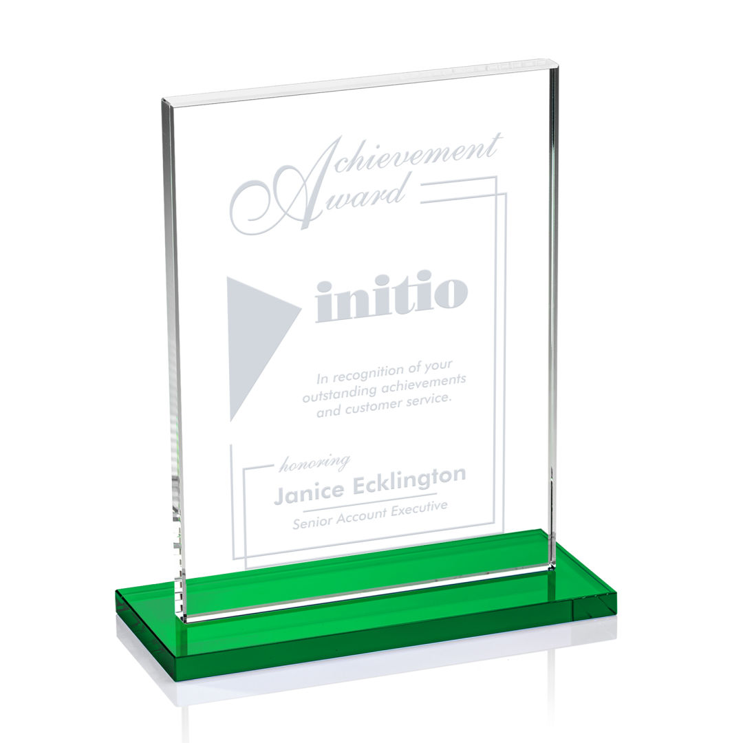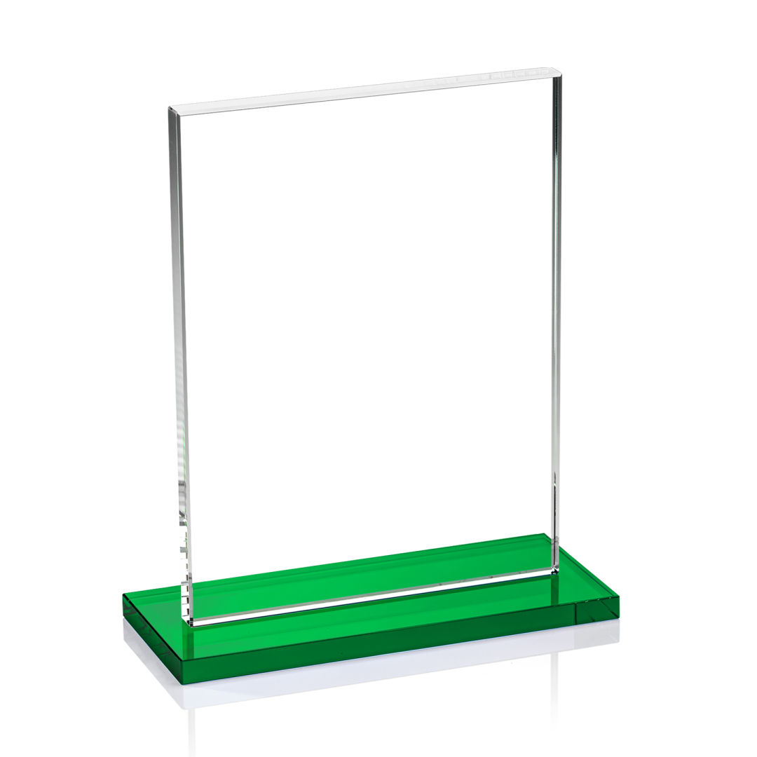 The Emperor Award is a simple yet elegant 0.5″ thick Starfire Crystal rectangle upright mounted vertical or horizontal on a emerald crystal base. An ideal award featuring a large decorating area to recognize a significant achievement. 5.0″ W x 6.375″ H x 3.0″ D
