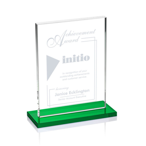 The Emperor Award is a simple yet elegant 0.5″ thick Starfire Crystal rectangle upright mounted vertical or horizontal on a emerald crystal base. An ideal award featuring a large decorating area to recognize a significant achievement. 5.0″ W x 6.375″ H x 3.0″ D