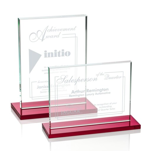 The Emperor Award is a simple yet elegant 0.5″ thick Starfire Crystal rectangle upright mounted vertical or horizontal on a ruby red crystal base. An ideal award featuring a large decorating area to recognize a significant achievement. Available with other bases, see associated items. 7.0″ W x 4.375″ H x 3.0″ D