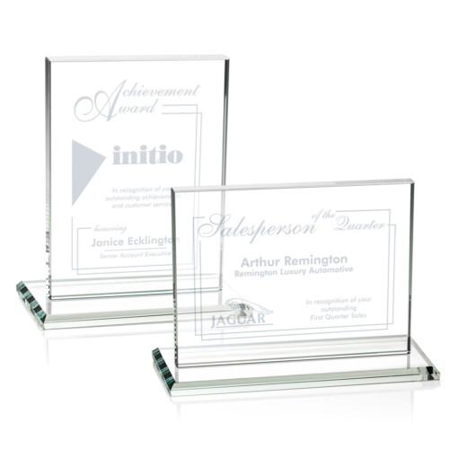 The Emperor Award is a simple yet elegant 0.5″ thick Starfire Crystal rectangle upright mounted vertical or horizontal on a beveled Starfire base. An ideal award featuring a large decorating area to recognize a significant achievement. 7.0″ W x 4.375″ H x 3.0″ D
