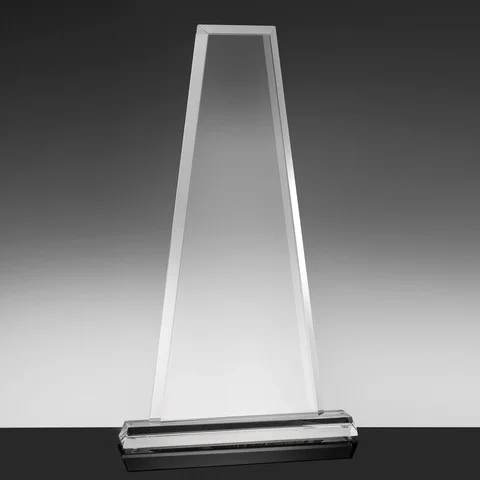 The Empire Tower Award features impressive steep bevels on three sides and is mounted to a matching base. Its extra large engraving area and heavy weight makes it an ideal product for an “M.V.P.” Award. Manufactured from 3/4″ thick Crystal Clear glass and standing at over 15 Inches tall this award is an attention getter. It is packaged in a premium quality presentation box. 9″ L x 1.6″ W x 15.7″ H