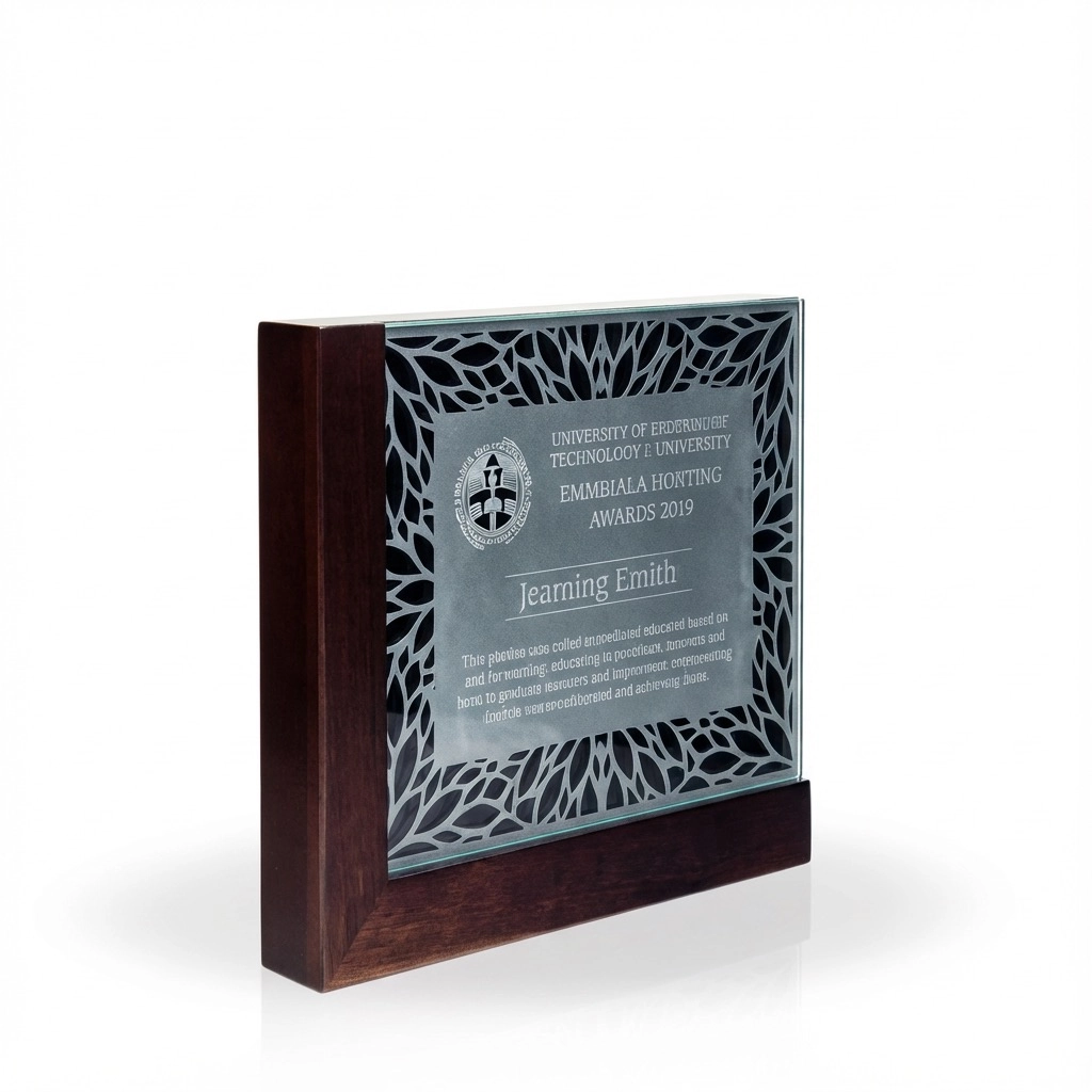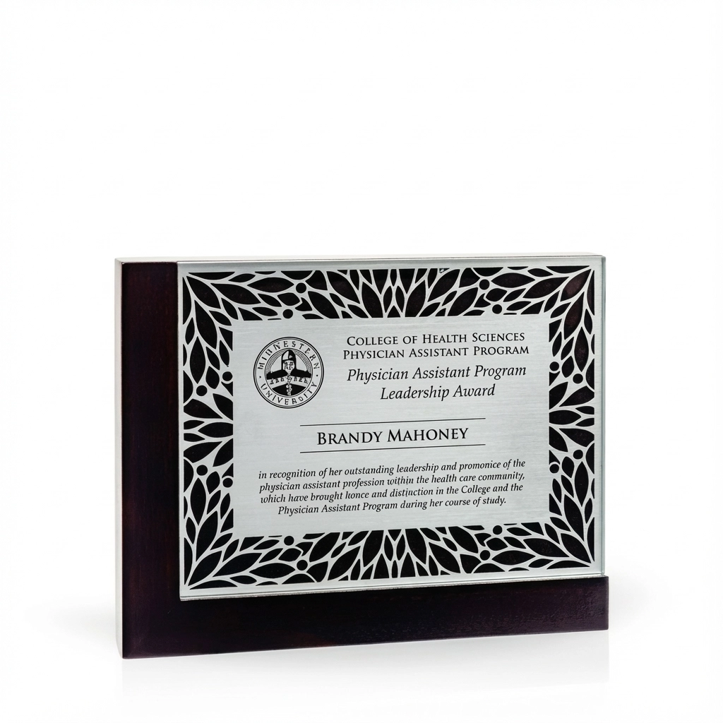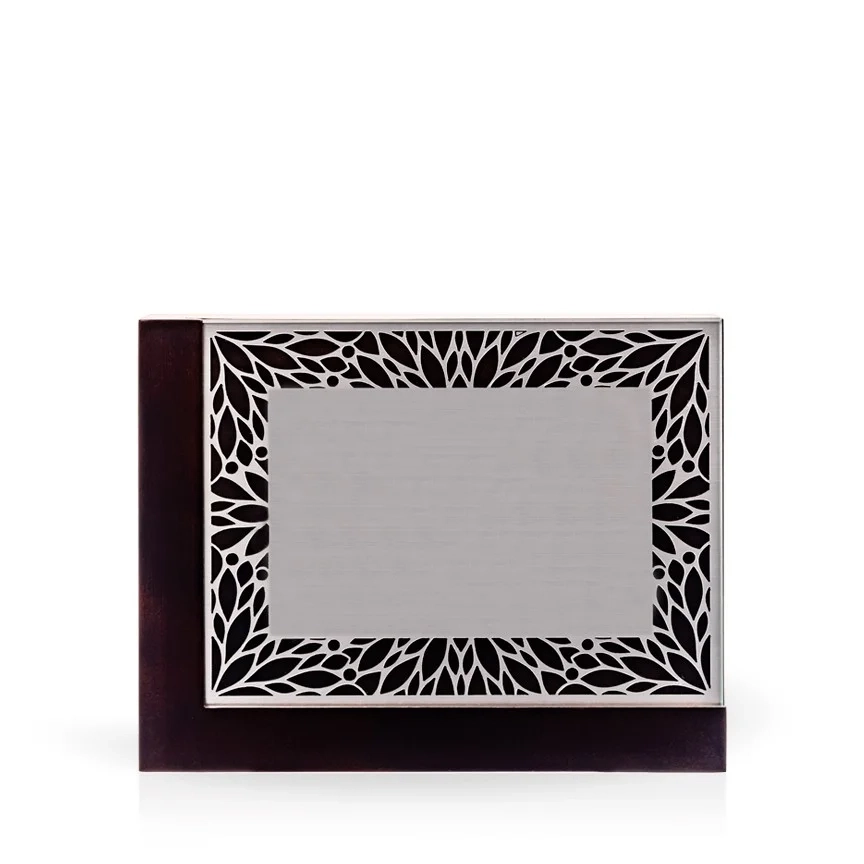 This modern looking desktop award is handcrafted from solid maple and stained to a deep, dark Espresso color. The warm, clean style makes it especially great for awarding those who work from home. The Espresso Wood Desktop Award can be presented in both vertical and horizontal orientation. The award includes a decorative, custom cut plate to engrave your logo and text. 6.75″ H x 8.75″ W x 1″ D