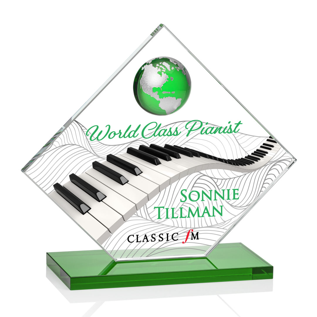 The Ferrand VividPrint™ Globe Award features a Starfire Crystal Diamond adorned with a magnificent emerald optical globe with continents etched and colorfilled silver. Complimented with a matching green base to create the perfect award to recognize a far reaching achievement or a green global initiative. 5.5″ W x 5.375″ H