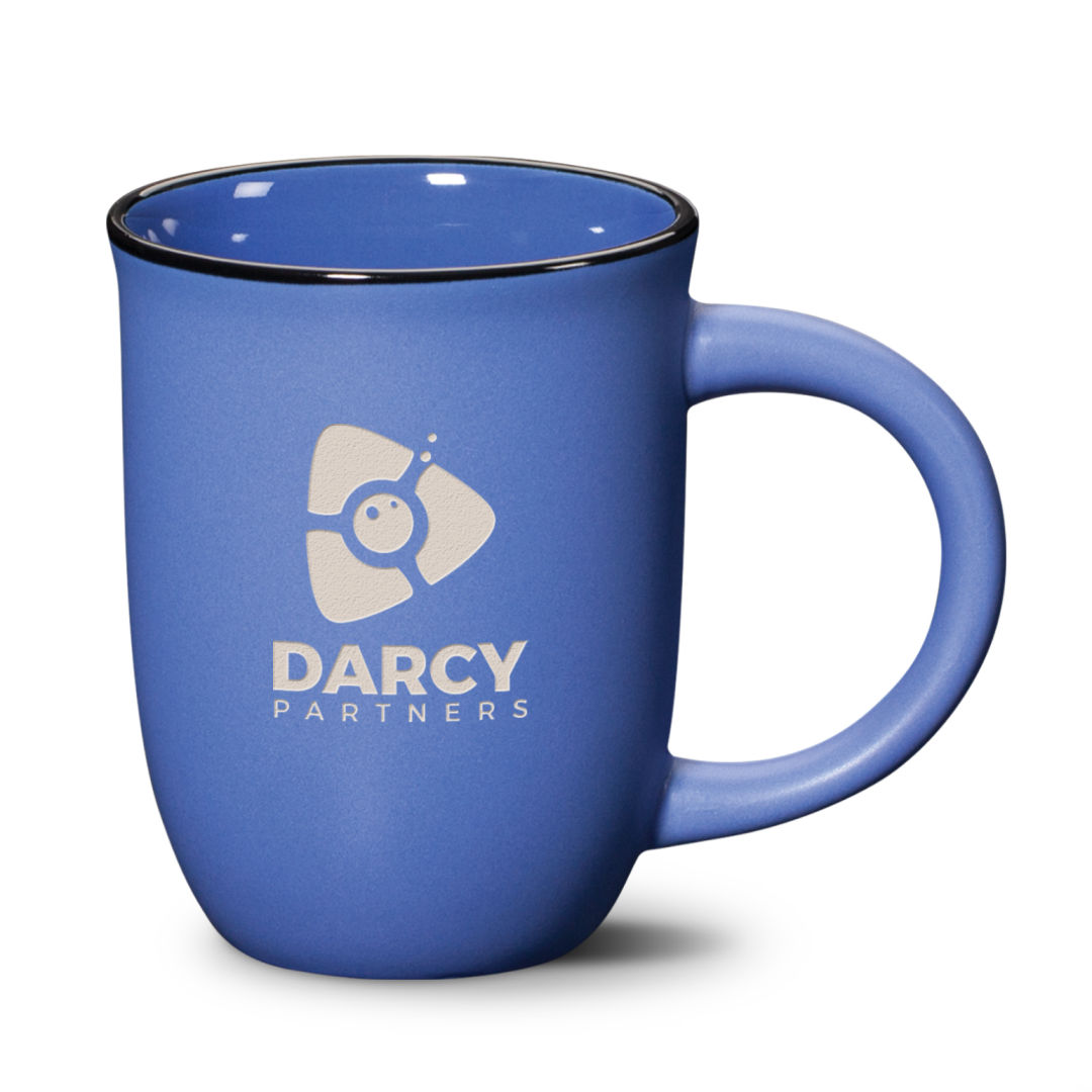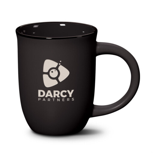 The subtle, sleek curved surface of the Fiona ceramic mug bells out gently at the top for an easy sip of freshly brewed coffee while the black glazed rim accent punctuates your brand message.