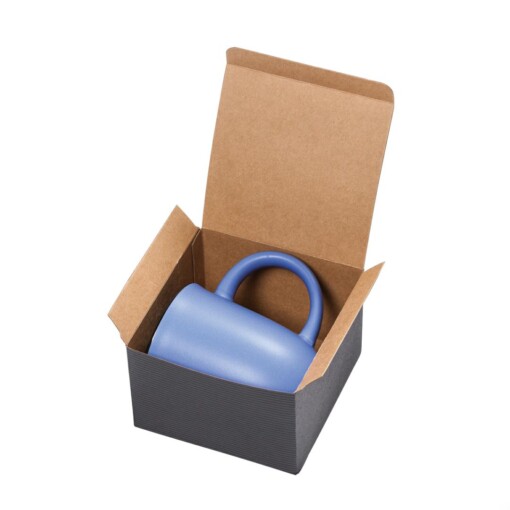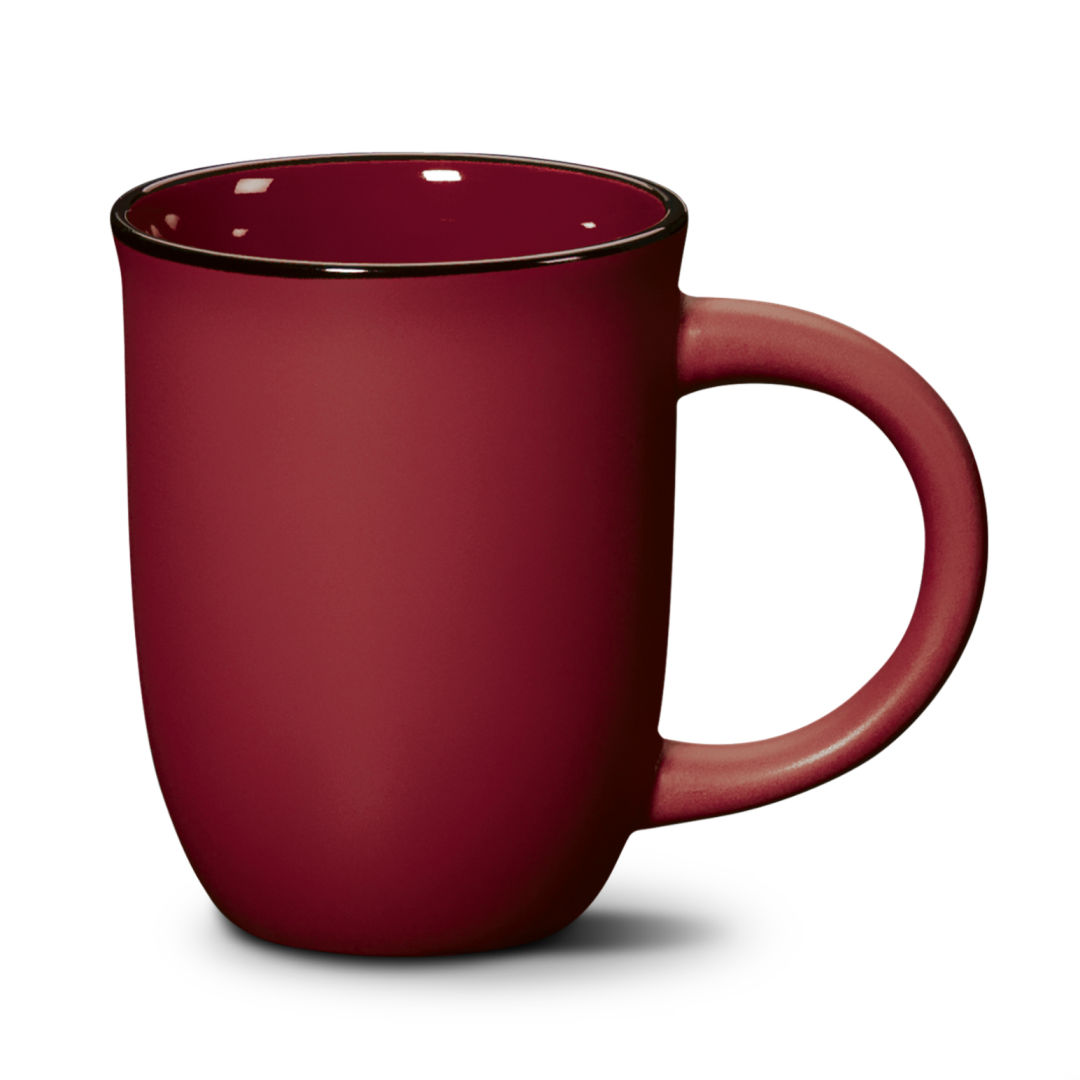 The subtle, sleek curved surface of the Fiona ceramic mug bells out gently at the top for an easy sip of freshly brewed coffee while the black glazed rim accent punctuates your brand message.